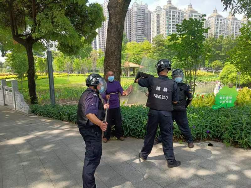 5月6日,安保中队组织防恐防暴演练,演练模拟犯罪嫌疑人逃到公园门口,巡逻值班人员发现后,立刻使用对讲机呼叫队员一起进行抓捕。保安队长对保安人员在自护自救及逃生避险的方法、防护器材的使用等多个方面的要求进行了详细的阐述,并拿起防护器材现场示范。通过此次演练,强化了安保人员应对暴力事件的危机意识,提高了安保队伍应对暴力事件的组织协调能力、应急处置能力和安全自保能力。