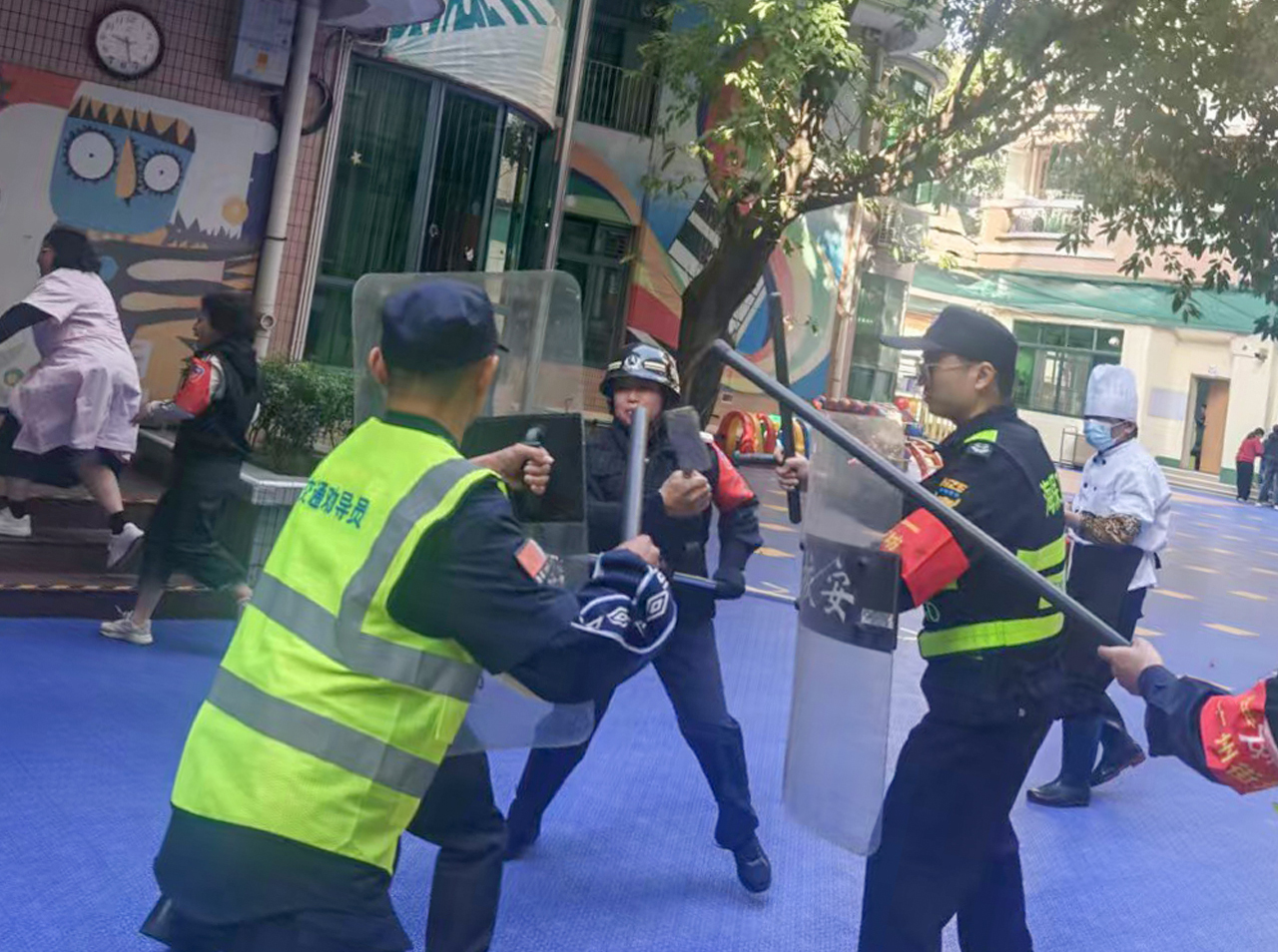 演练开始前,昌岗服务部经理范玉江亲自带队,向参与人员详细讲解演练流程及安全要点。他强调:“校园安全无小事,要以‘万无一失’的标准做好防控工作。”随后,演练模拟突发暴恐分子闯入校园场景。保安员迅速启动应急响应,手持防暴盾牌、钢叉等装备,与“暴徒”展开周旋。整个过程紧张有序,分工明确,展现了昌岗队员专业的应急处置能力。
