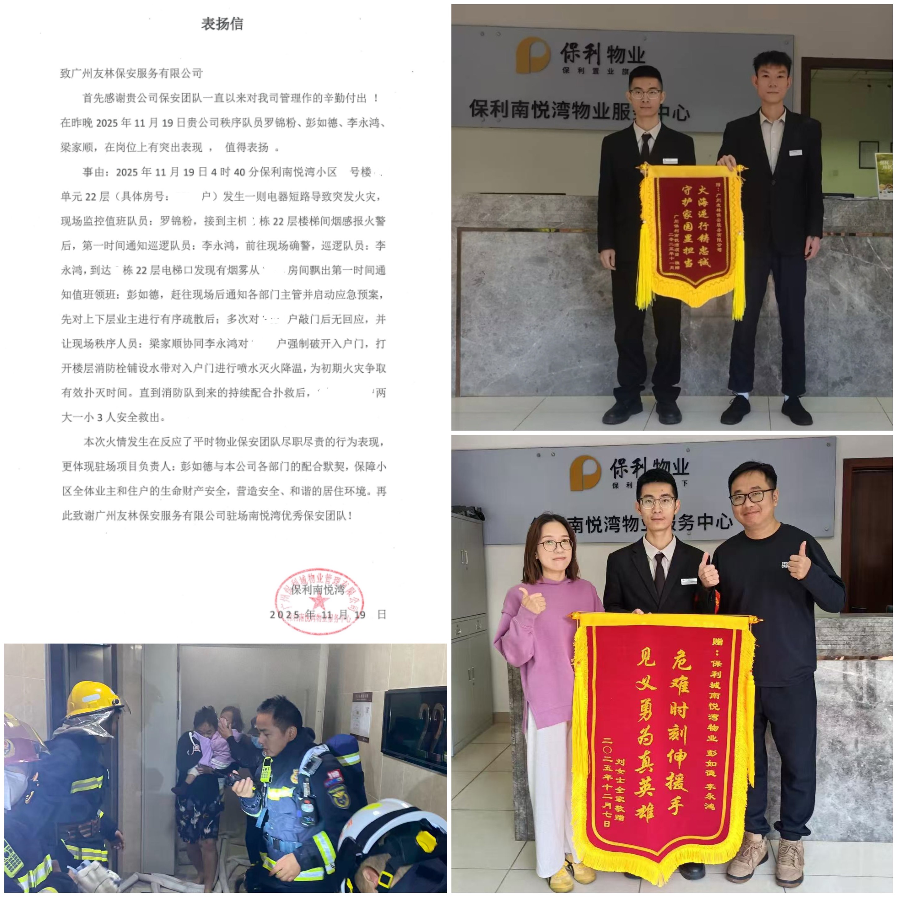 火场救援显担当:凌晨,住宅小区突发火情,领班彭如德带领队员李永鸿启动应急预案,3分钟内完成破门救援,成功转移被困一家三口。物业方赠送“危难时刻伸援手,见义勇为真英雄”锦旗,高度肯定团队“快速响应、科学处置”的专业能力。