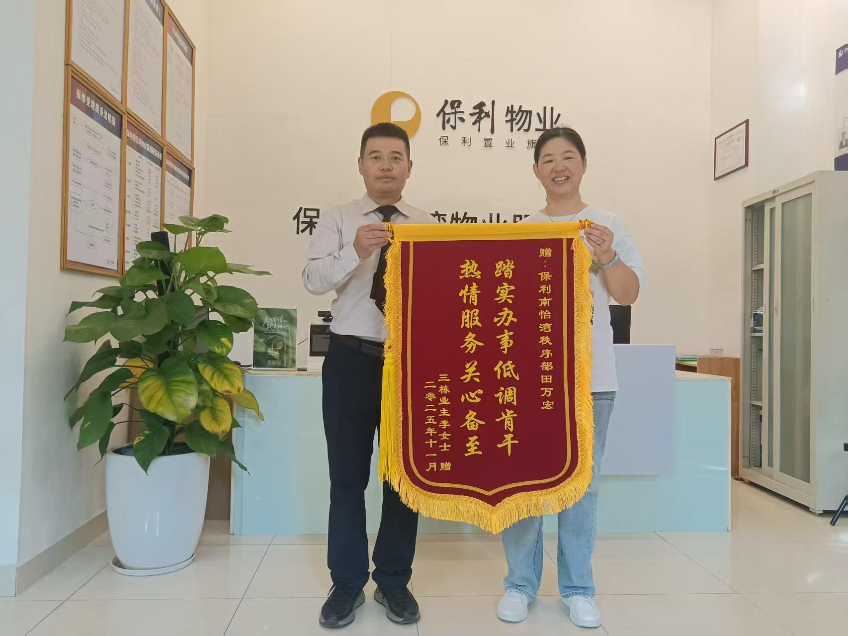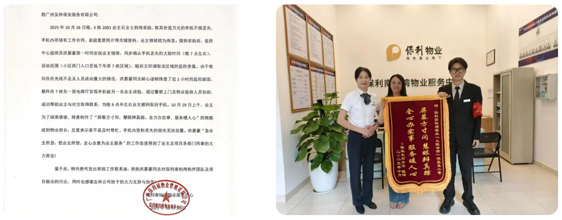慧眼辨真寻手机:队长洪嘉豪为帮心急的业主寻回重要手机,逐帧排查海量监控视频,最终顺利物归原主。业主特意送来锦旗,这份沉甸甸的肯定,尽显友林人的责任与细致。