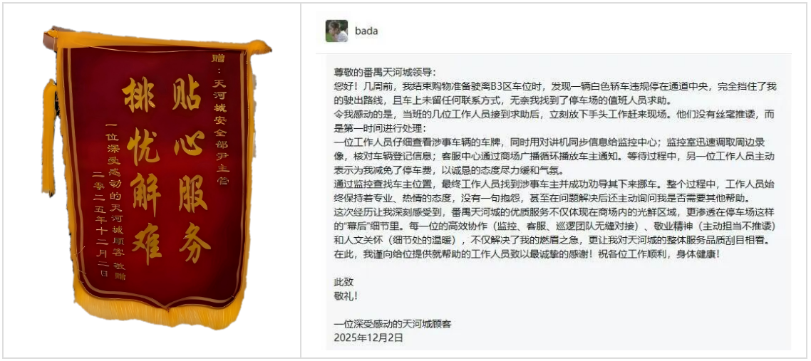 热心疏导解困局:顾客车辆被违停车辆困住,友林安保尹主管第一时间协调监控广播寻人,还主动协助沟通减免停车费,顺利化解了顾客的燃眉之急。锦旗上的赞誉,是对这份贴心服务的最好认可。