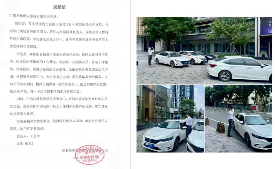 规范服务树标杆:队员王恩会始终以标准的执勤姿态、暖心的微笑服务赢得客户一致好评,更以“传帮带”的精神带动团队服务水平整体提升,获物业专函表扬。