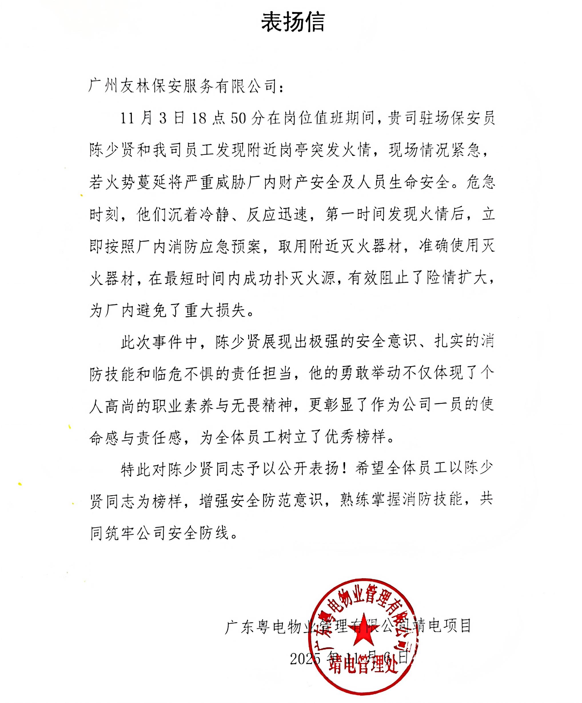 广州友林保安服务有限公司全体队员坚守岗位,以“安全守护+温情服务”双轨并行模式,在应急救援、便民服务、客户关怀等领域践行社会责任,累计收到锦旗6面、表扬信5封,用实干与担当书写行业服务的暖心典范。