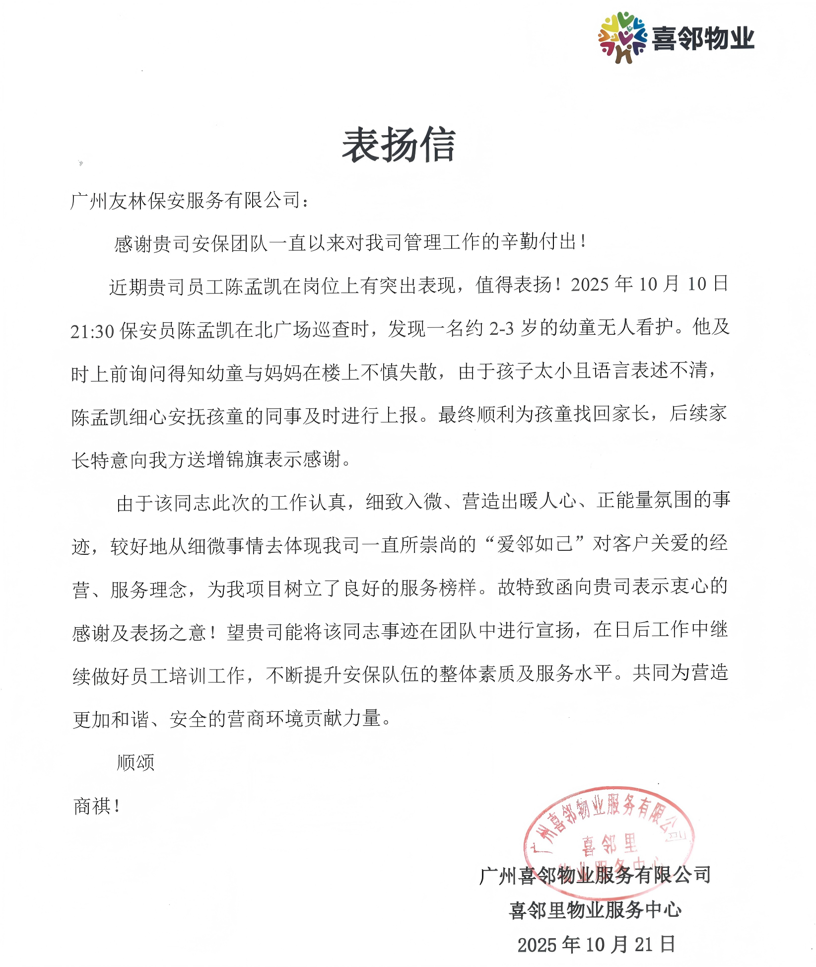 爱心守护助归家:队员陈孟凯执勤时发现走失幼童,全程温柔照看、耐心安抚,最终助其平安回到家长身边。家长的连声致谢、物业方的亲笔表扬信,是对友林人“爱邻如己”最生动的诠释。