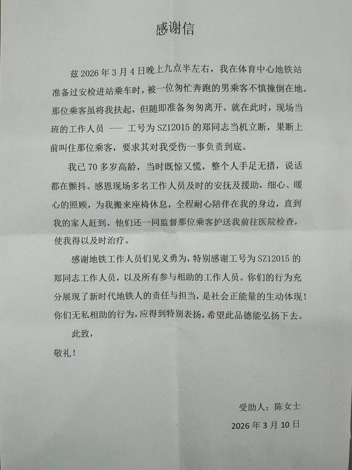 事后,陈女士特意写下感谢信,字里行间满是感激之情:“你们的行为充分展现了新时代地铁人的责任与担当,是社会正能量的生动体现!”