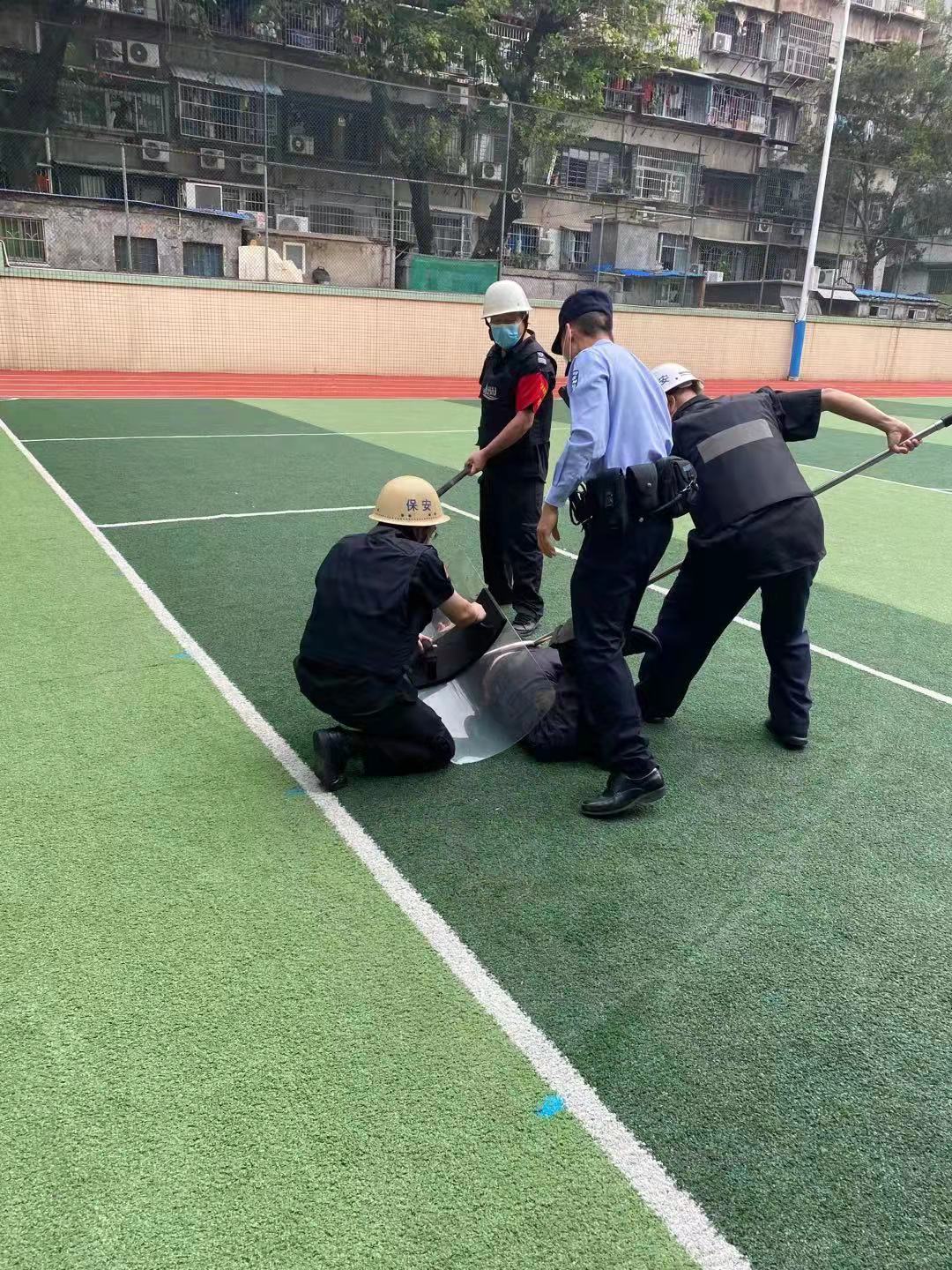 随后,全校师生进行“应急避险”及“安全疏散”演练,由保安队员扮演的“暴恐分子”对学生或保安队员进行突袭,学生快速反应寻求周边保安员的庇护,保安员面对“暴恐分子”迅速组成包围圈并持械与之对抗,随后将其制服,其余保安员协助老师们引导学生们有序疏散,远离危险。
