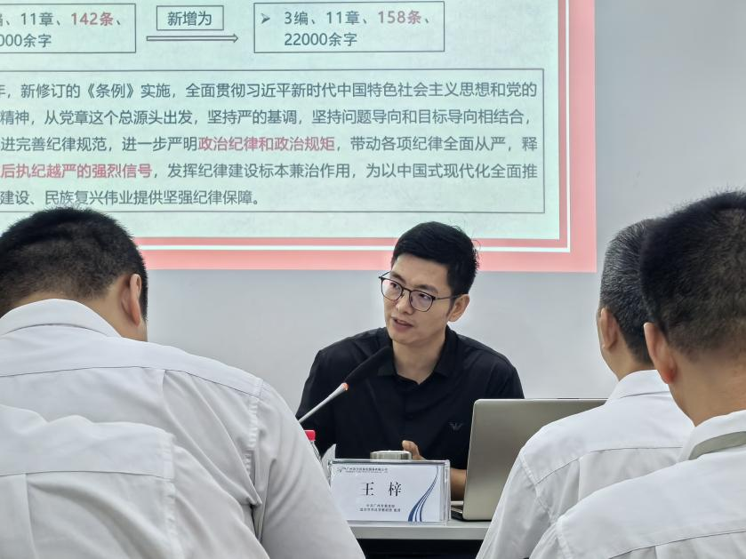 党支部书记朱鑑波做总结发言,感谢王教授精彩授课。并表示,下一步,广州市天河保安服务有限公司党支部将以更加丰富多样的形式,督促公司全体党员、干部、团员把党纪学习教育抓在经常、融入日常,推动学习教育走深走实、确保入脑入心、落到实处。