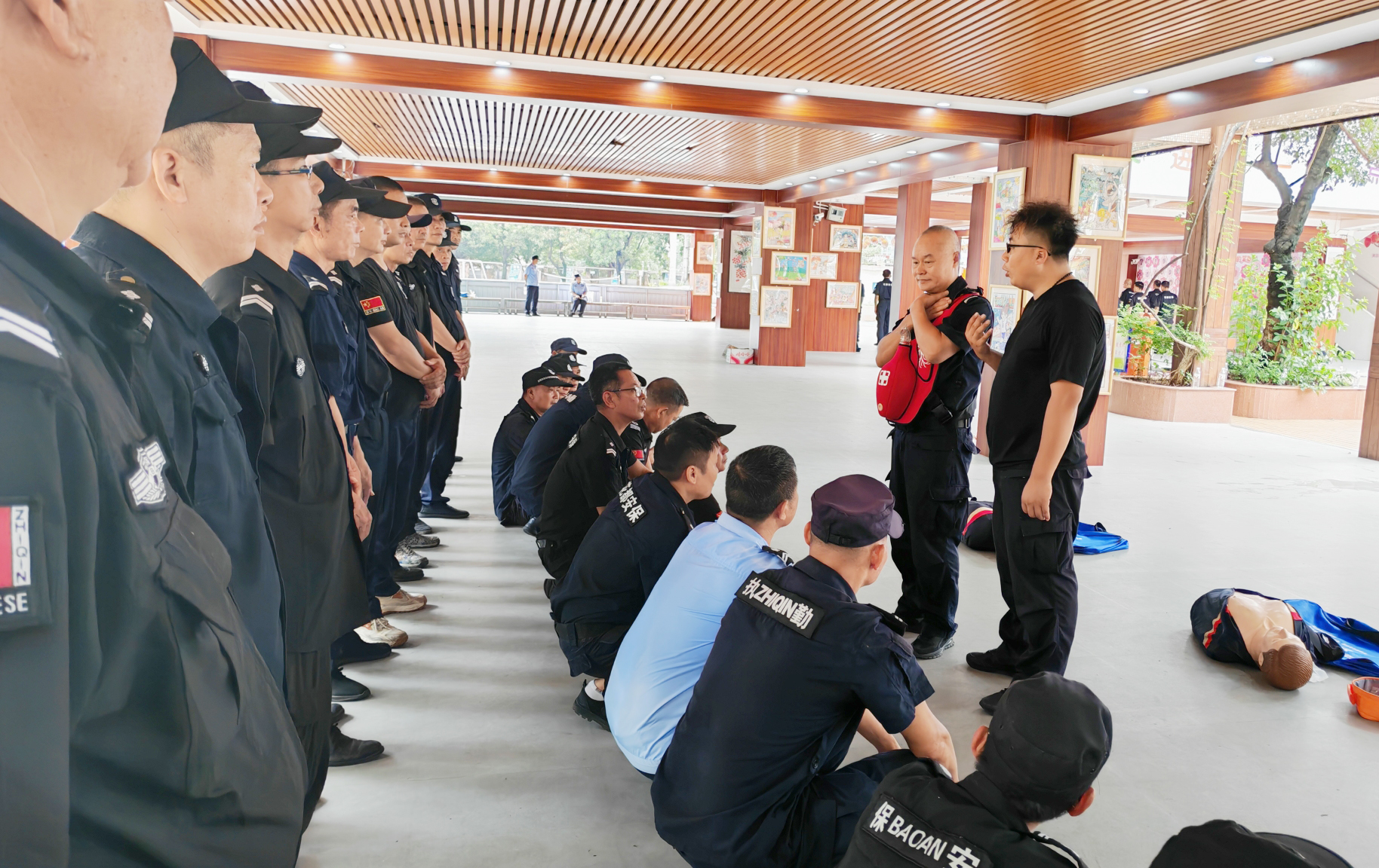 吸收指导,成果运用。花都区公安分局治安大队和特警大队对第一阶段培训进行全程指导,花都区保安公司结合治安大队和特警大队的指导意见,认真复盘第一阶段培训内容,重新设置第二阶段培训日程,增配培训人员,调整培训组织形式,务必将第一阶段吸收的“营养”运用到第二阶段培训中。同时,辖区派出所给予花都区保安公司支持和指导,专门派出民警到现场督导和拉练,使“警保联动”在校园安全最前沿发挥实效。城东派出所民警参加到现场组训中,肯定了花都区保安公司培训人员的专业性,强调了在岗培训的必要性和重要性,希望今后能增加培训频次和丰富培训内容。7月22日至7月24日期间,花都区保安公司组织新华街、秀全街、新雅街、花城街公办学校保安员和部分教职工进行培训,受训人数超过320人。