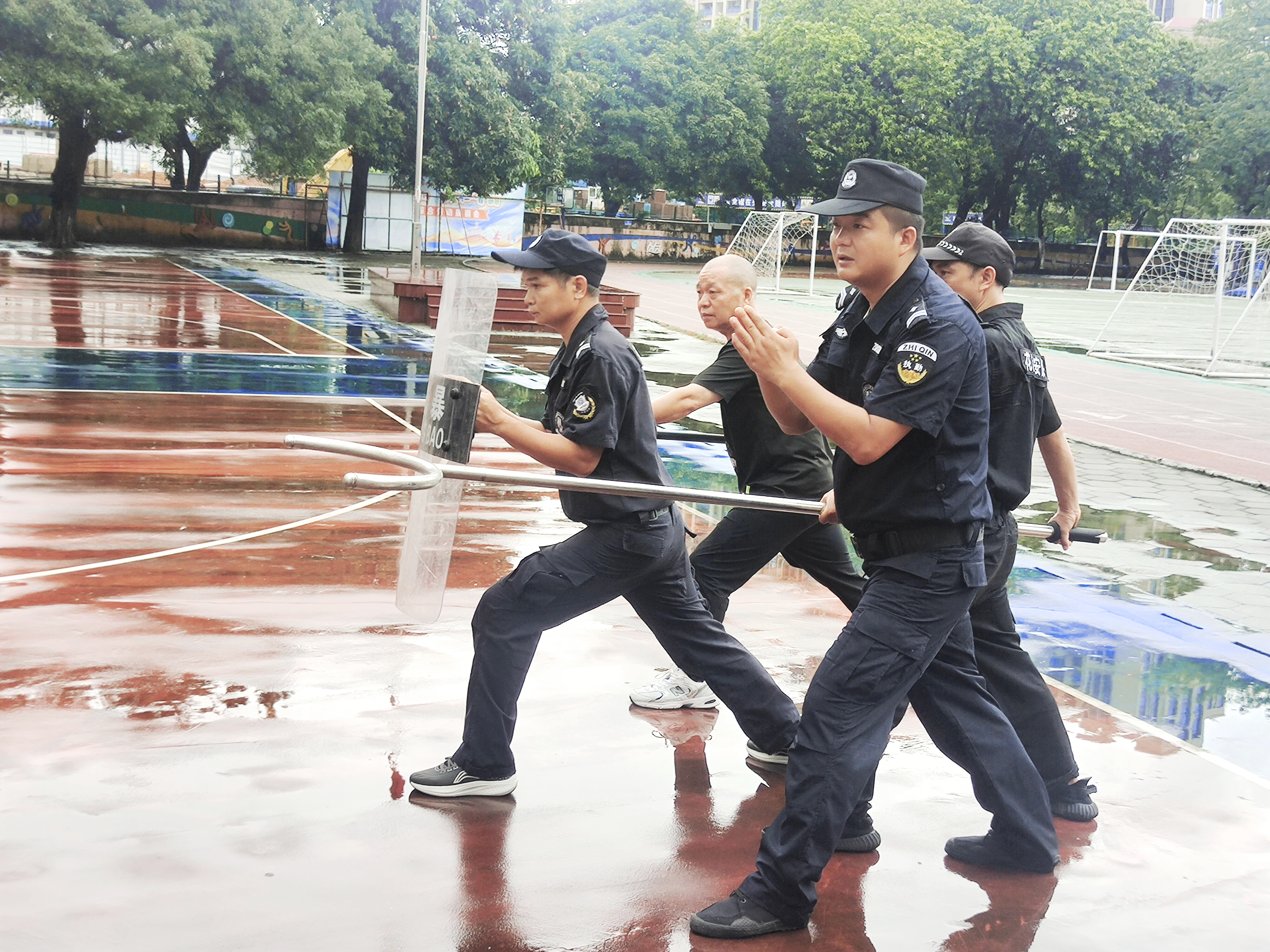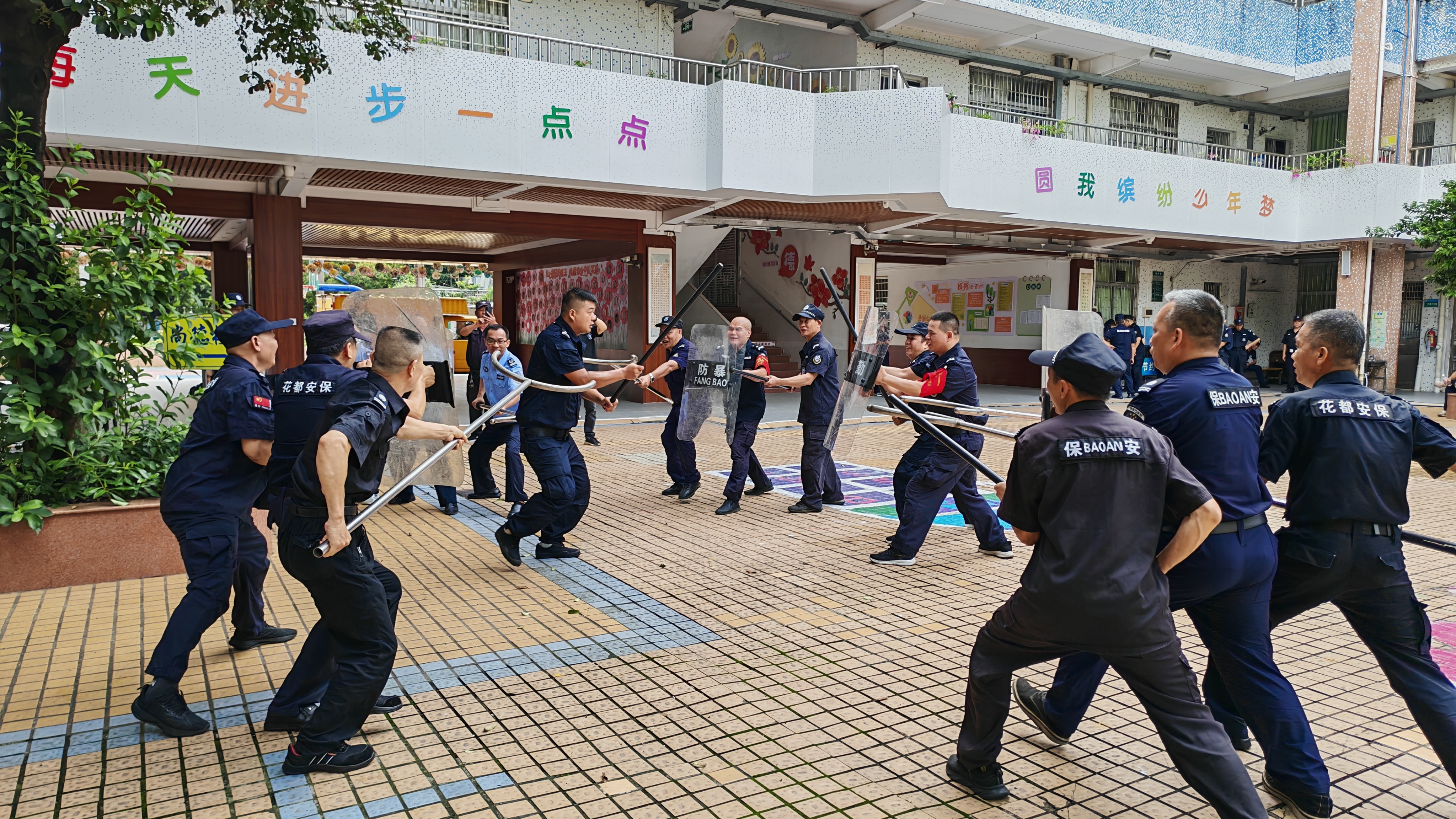 温故知新,常学常新。第二阶段培训在最小应急单元处置、消防、急救、队列训练四项基本项目的基础上,花都区保安公司根据不同学龄段安全需求实施精准化教学:针对低龄段(幼儿园、小学)环境特点,重点强化校园保安队伍的反恐防暴协同作战能力;面向高龄段(中学)学生群体,则着重提升校园保安队伍紧急疏散时的组织与引导技能。在反复练习的装备应用、组队、冲击、制服过程中,让校园保安队伍对校园安全有了更深地理解。