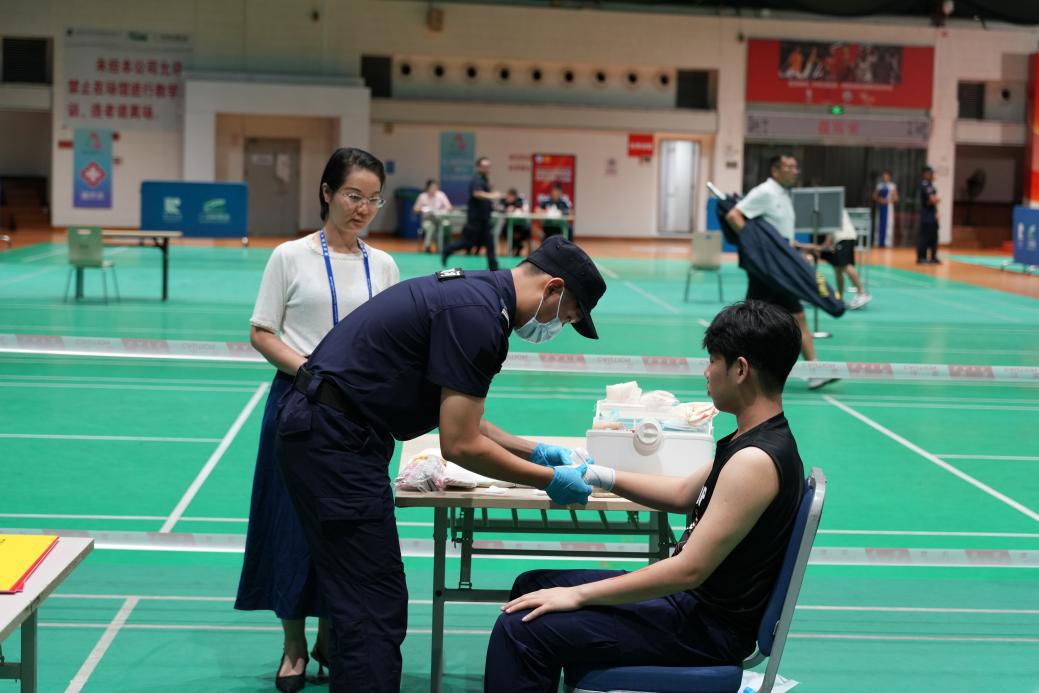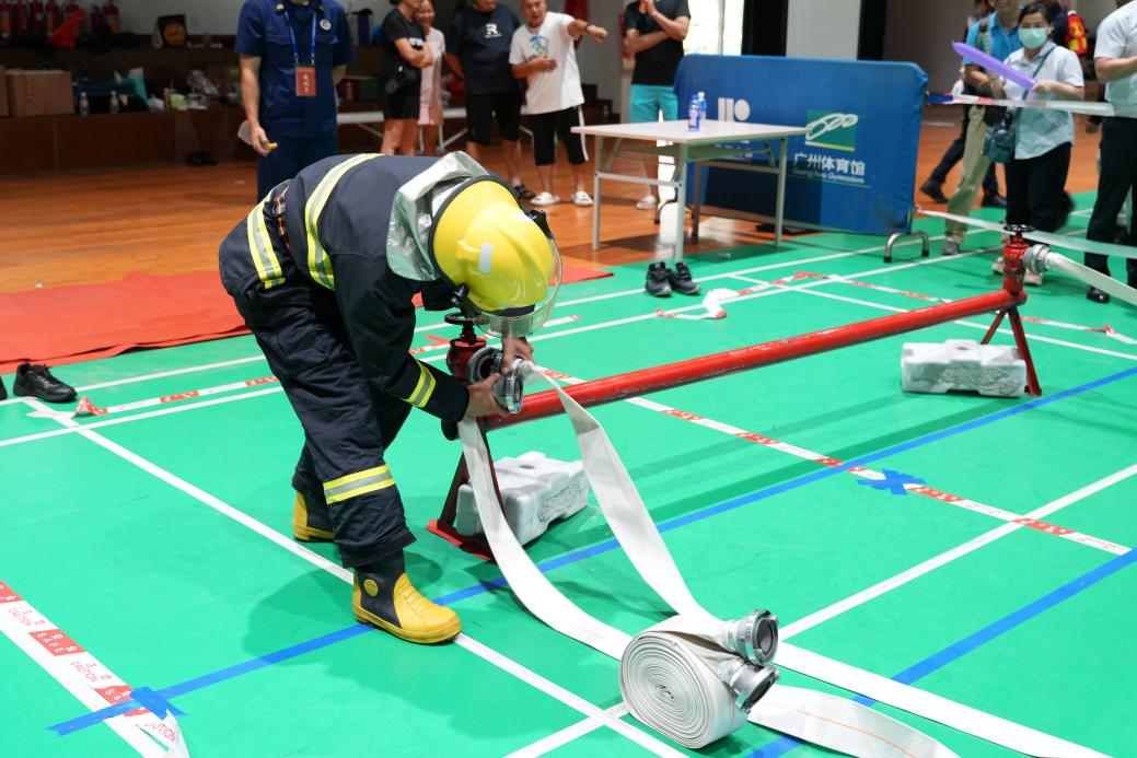 比赛当日,天河保安公司的参赛队员们精神抖擞、士气高昂,以最佳状态迎接各项挑战。在队列基本动作展示中,他们步伐整齐、动作规范、口号嘹亮,展现出严谨的纪律作风;在消防实操技能环节,队员快速完成全套消防服穿戴,熟练完成两盘水带的操作等流程,动作精准高效;应急医疗救助项目中,队员沉着冷静地运用专业急救知识进行模拟救治,操作规范娴熟;尤其是在最小应急单元演练环节,面对突发“险情”,队员们反应迅速、分工明确、配合默契,一系列应急处置动作行云流水,充分展现出扎实的专业功底和出色的团队协作能力,赢得了现场评委和其他参赛队伍的一致认可与好评。值得一提的是,公司党支部副书记施革胜、法人代表兼副总经理明贺荣、副总经理梁权也亲临比赛现场,为全体参赛队员加油鼓劲,极大地激发了队员们的斗志。