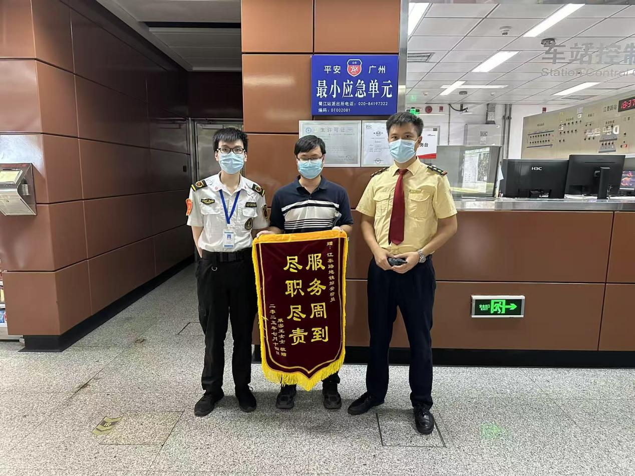 近日,广州地铁二号线江泰路站 D 口安检点迎来一位特殊的访客。一名男乘客手持一面鲜红的锦旗,郑重地送到海保安检员手中,以此感谢他们此前对其家人的热心帮助。锦旗上 “服务周到 尽职尽责” 八个金色大字,格外醒目地彰显着乘客的诚挚谢意。