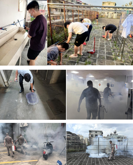 市总保组织员工对基地进行全面环境整治,重点对员工宿舍、排水沟渠等蚊虫孳生场所进行彻底消杀,并督促队员保持居住环境整洁、及时清理积水,消除蚊虫孳生条件。