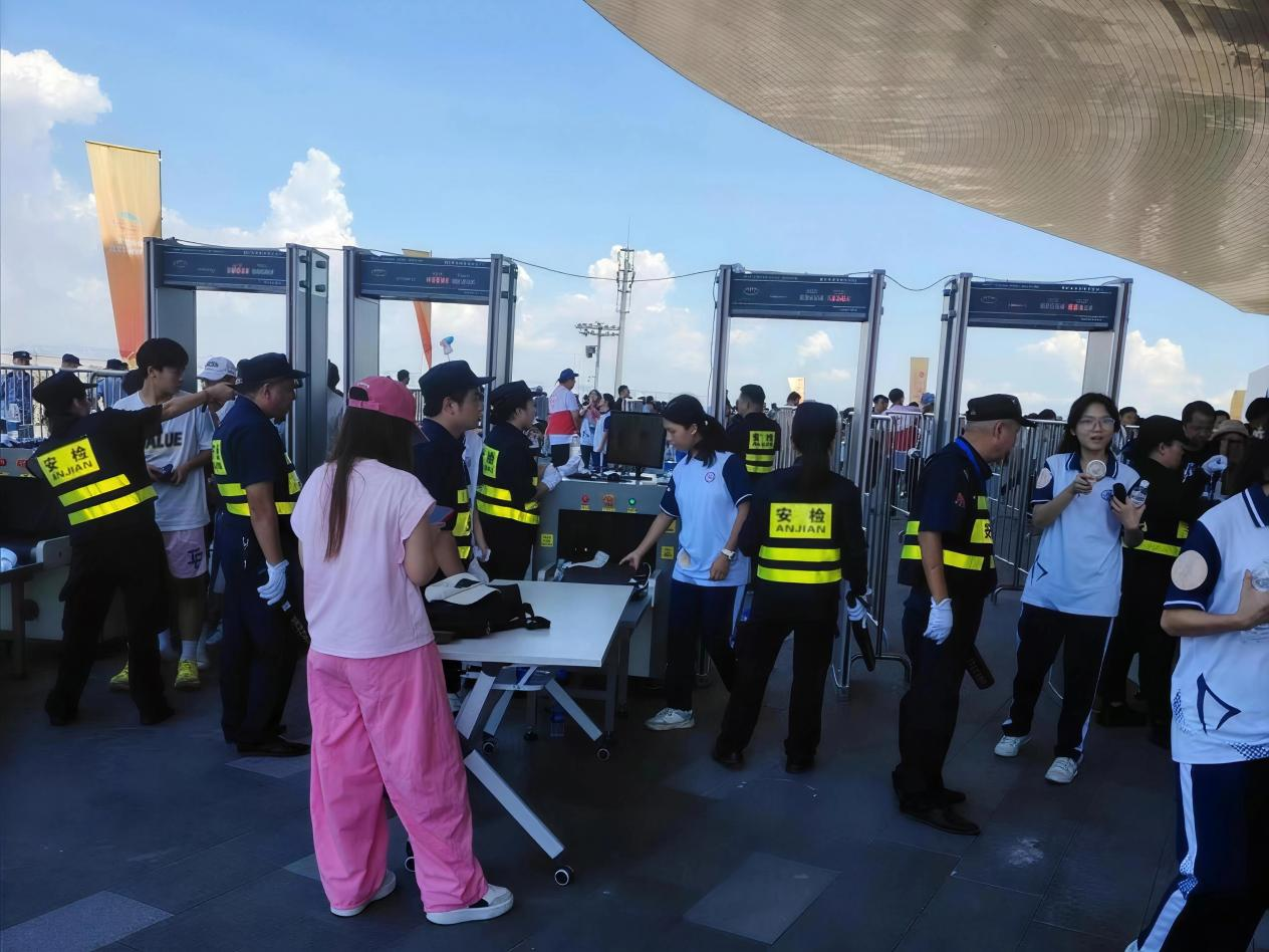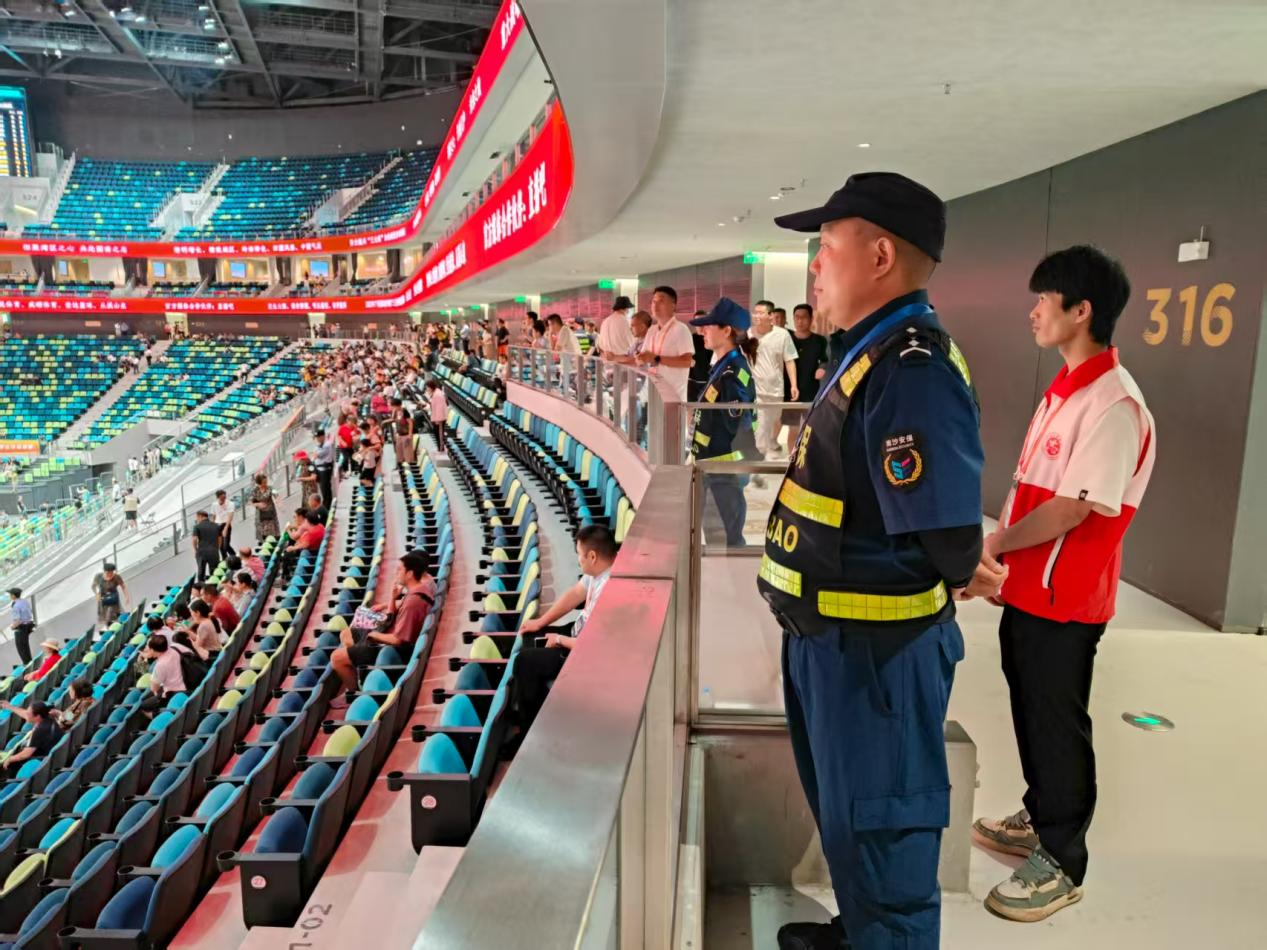 场上赛事激战正酣,场下藏蓝守护常在。根据赛事安保方案,安保人员们提前到达场馆,各司其职,在安检通道、内场、外场等重点管控点位严密坚守,认真履行安检、秩序维护、交通疏导、巡逻防控等工作职责,规范、有序地落实赛事安保服务保障。