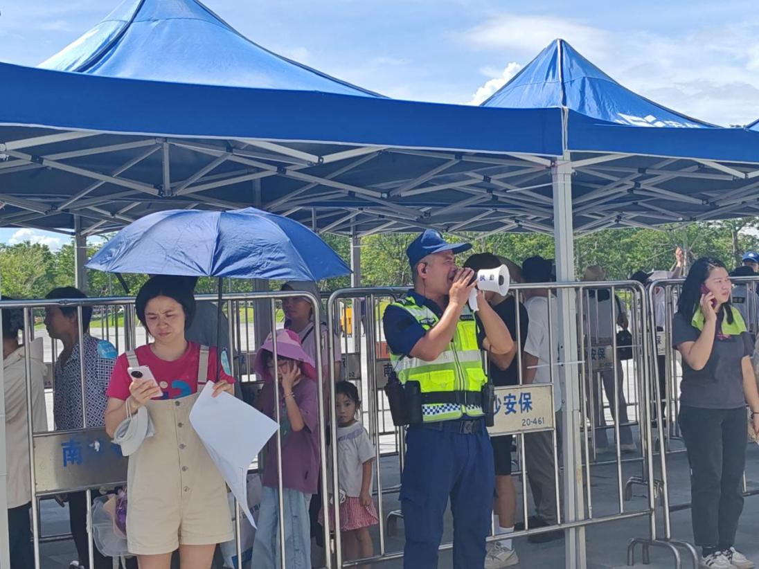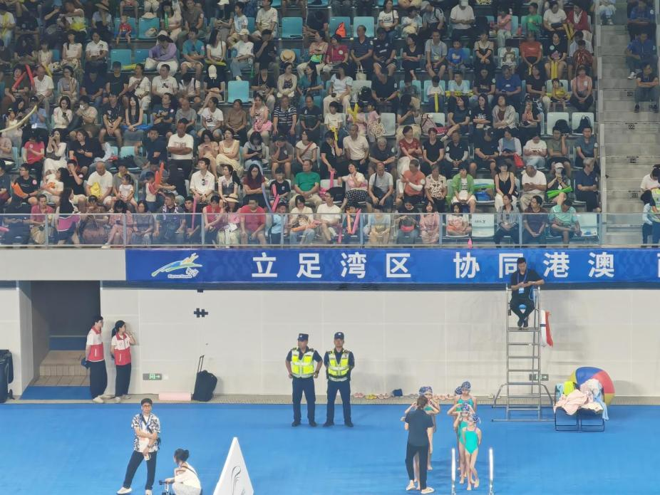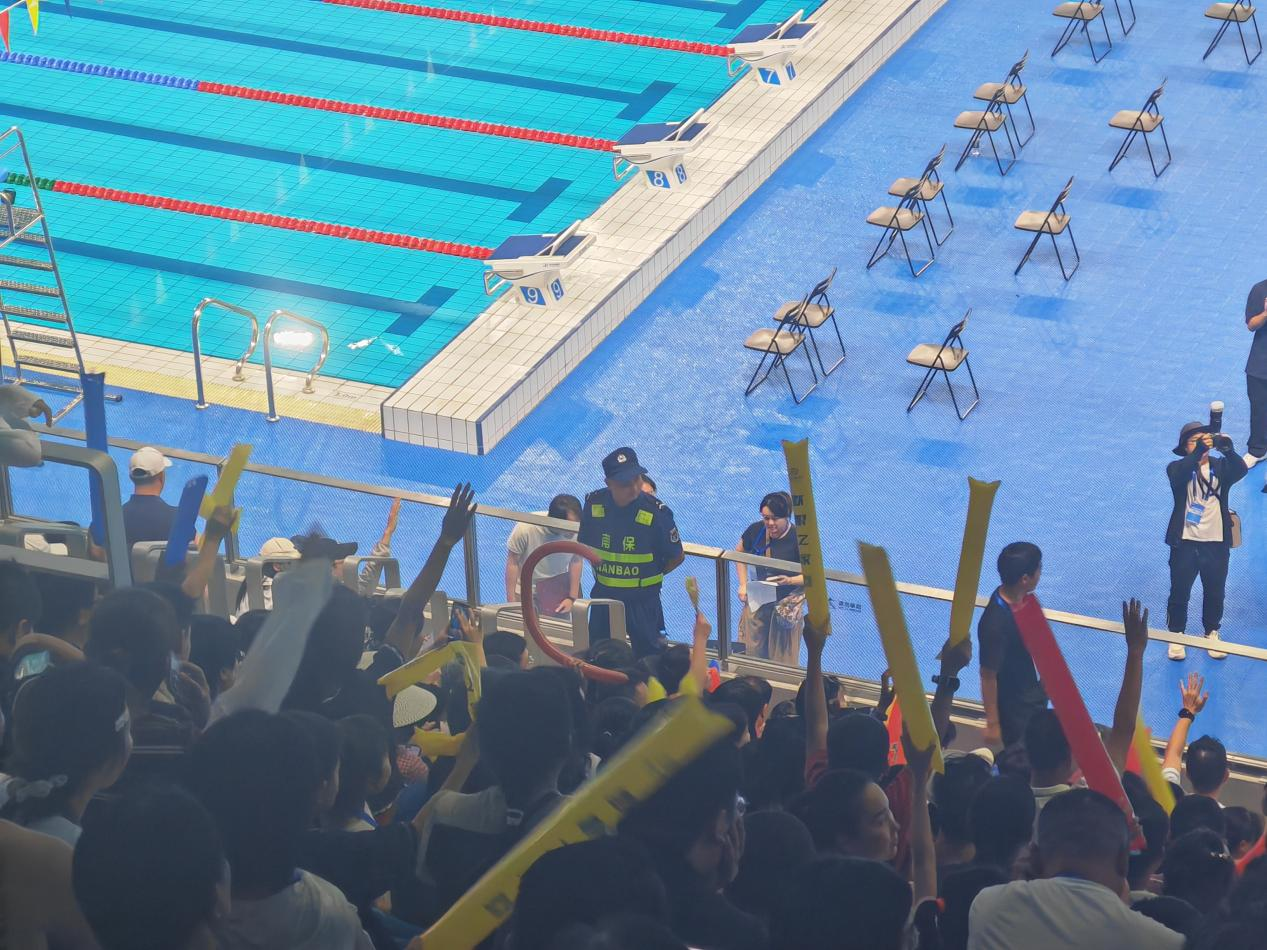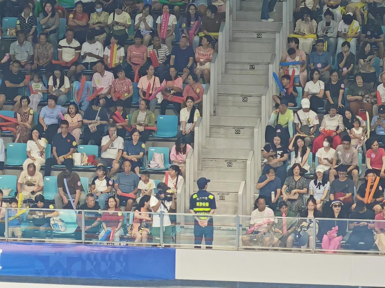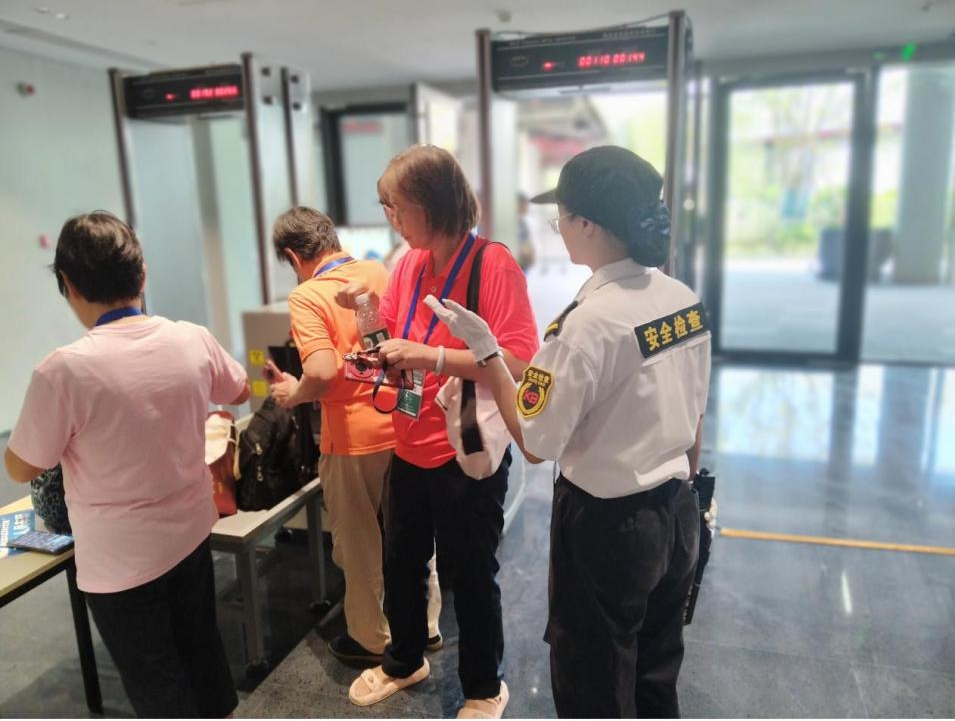 比赛当天,全体安保人员精神饱满,提前到岗。入口, 队员们顶着烈日,一遍一遍提醒观众提前准备入场凭证;安检口,队员们严格执行标准化流程,一丝不苟地检查每一位入场观众,将安全隐患坚决挡在门外;观众席上,他们在人流密集区域与通道精准引导,有效维护了现场秩序,避免了拥堵踩踏风险……他们用严谨、专业和汗水,默默守护着“碧波池”边的每一次精彩“梦之跃”。