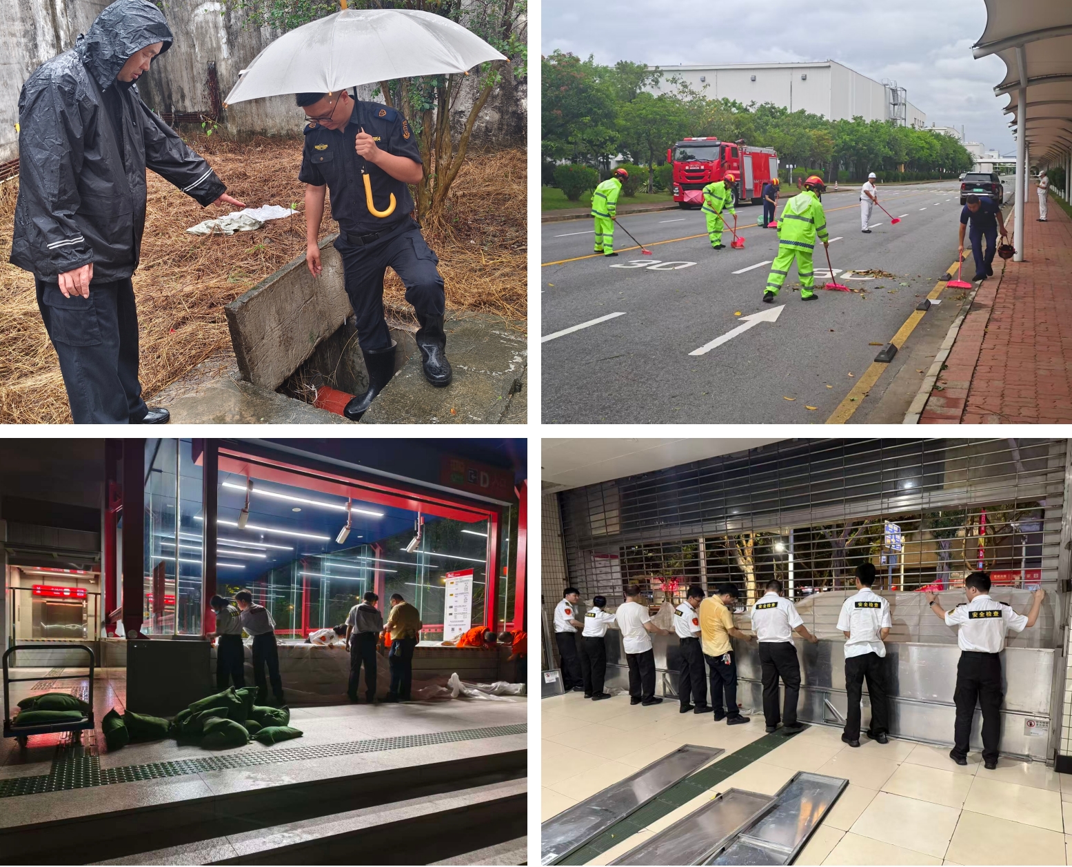 为应对台风来袭,市总保安保、安检、物业人员提前部署并做好充足准备。一是对守护点内的排水口、高空悬挂物、地下室入口、电力设施等重点部位进行全面隐患排查和加固;二是积极筹备雨衣、雨靴、救生衣、手电筒、沙袋、抽水泵等防汛物资,确保关键时候“拿得出、用得上”;三是组建巡逻组、抢险组、疏导组,明确各岗位职责,确保台风期间各项工作有序开展;四是根据项目应急预案,合理调整了台风期间一线工作人员的执勤安排,并成立了80人应急保障队伍,做好应急支援准备。