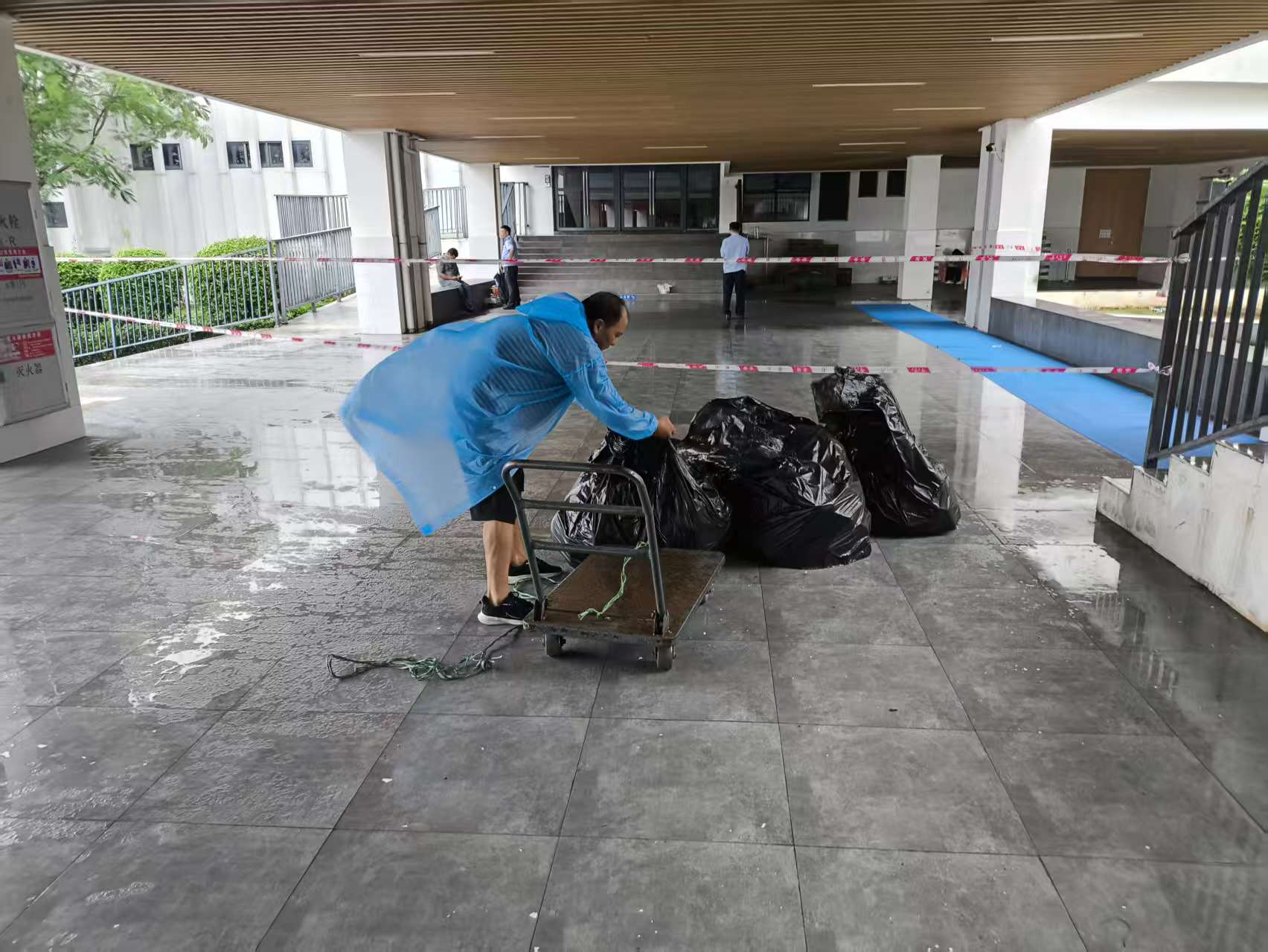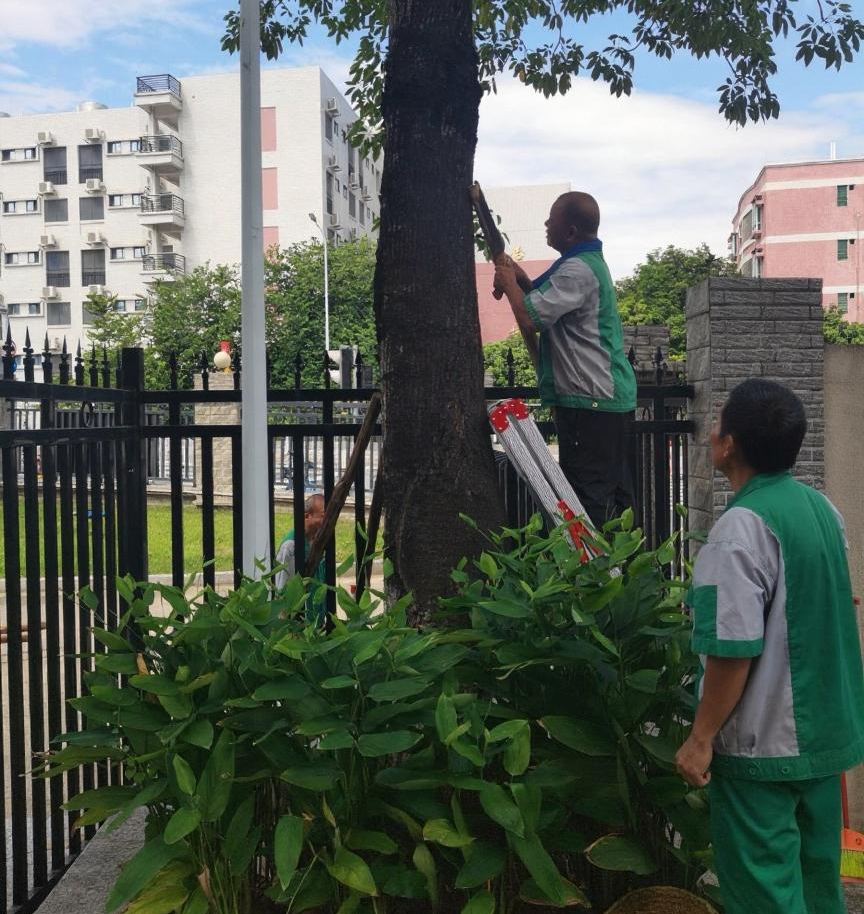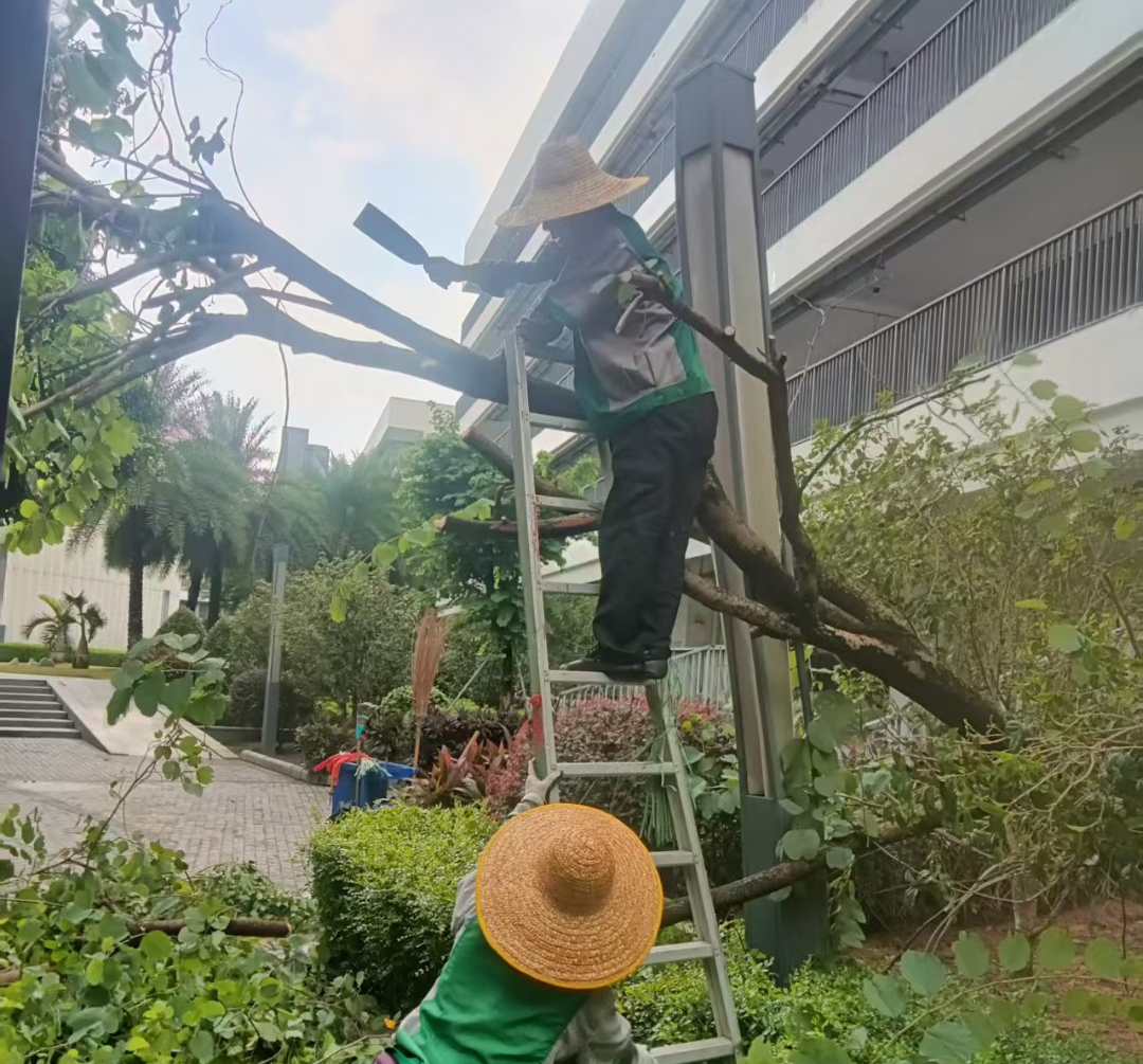 随着台风影响逐渐减弱,粤顺公司及时转入台风后恢复阶段,按照“安全第一、有序推进”原则,全面开展环境清理、设施检修和安全评估工作。通过对服务区域进行“回头看”,重点排查围墙基础、供电线路、绿化树木等潜在隐患,及时统计受损情况,为后续修复提供依据。同时加快清理倒伏树木、垃圾杂物和积水区域,对受损设施进行围蔽警示,严防次生事故发生,尽快恢复正常办公秩序。