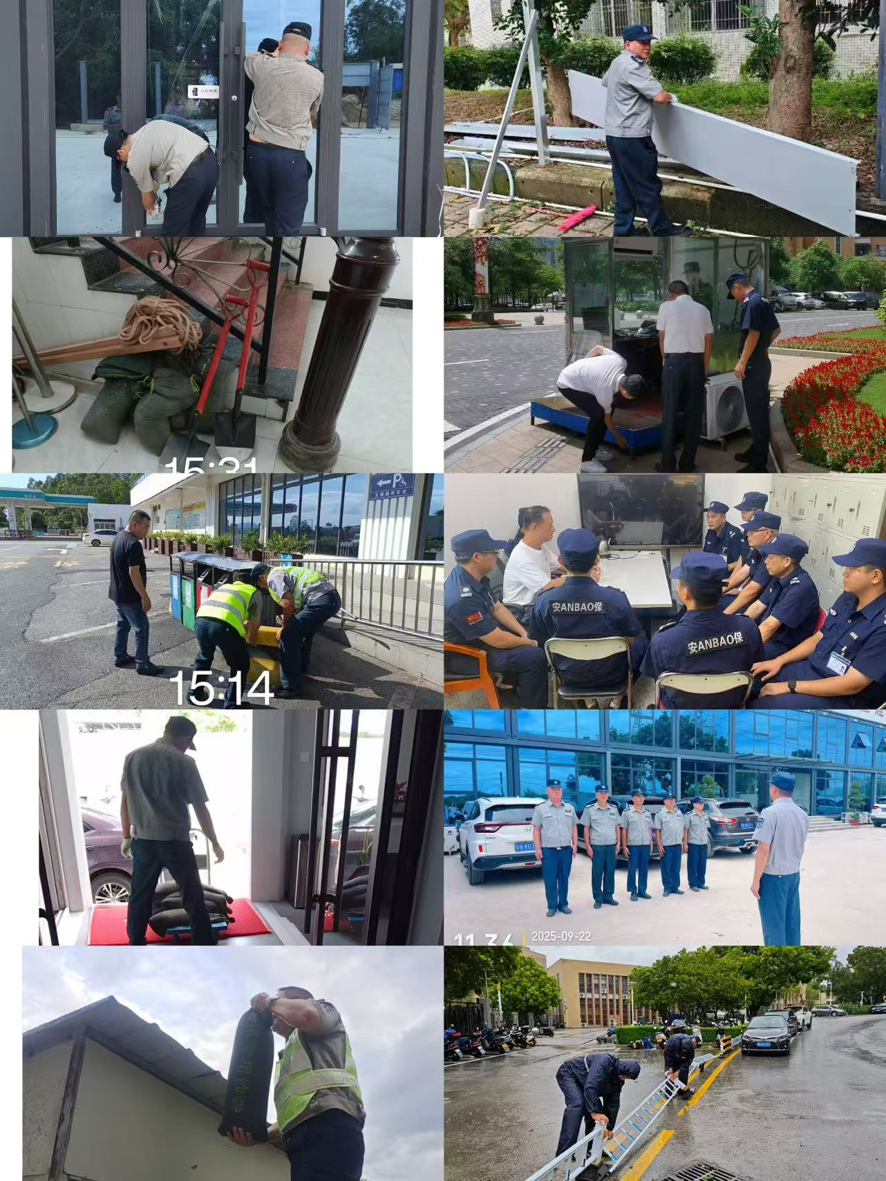 自9月23日全市实施“五停”措施以来,公司驻点保安队员全员在岗值班值守,公司安排值班员执行24小时轮班值守制度。在党政机关、工业园区等重点单位,队员们提前做好防御工作、重点巡查配电房、地下车库等关键区域,设置挡水板、堆放沙袋阻断雨水倒灌。
