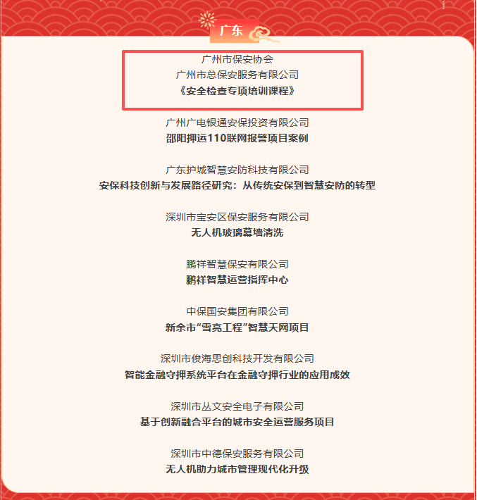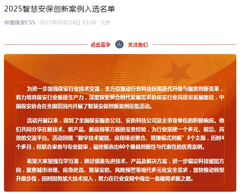 9月24日,中国保安协会发布《2025智慧安保创新案例名单》,全国共有60个兼具创新性与代表性的优秀案例入选。其中,广州市保安协会与广州市总保安服务有限公司(简称“市总保”)联合申报的《安全检查专项培训课程》,在历时四个多月评选活动中,经联合审查与专业复审,成功入选中国保安协会“2025智慧安保创新案例”。