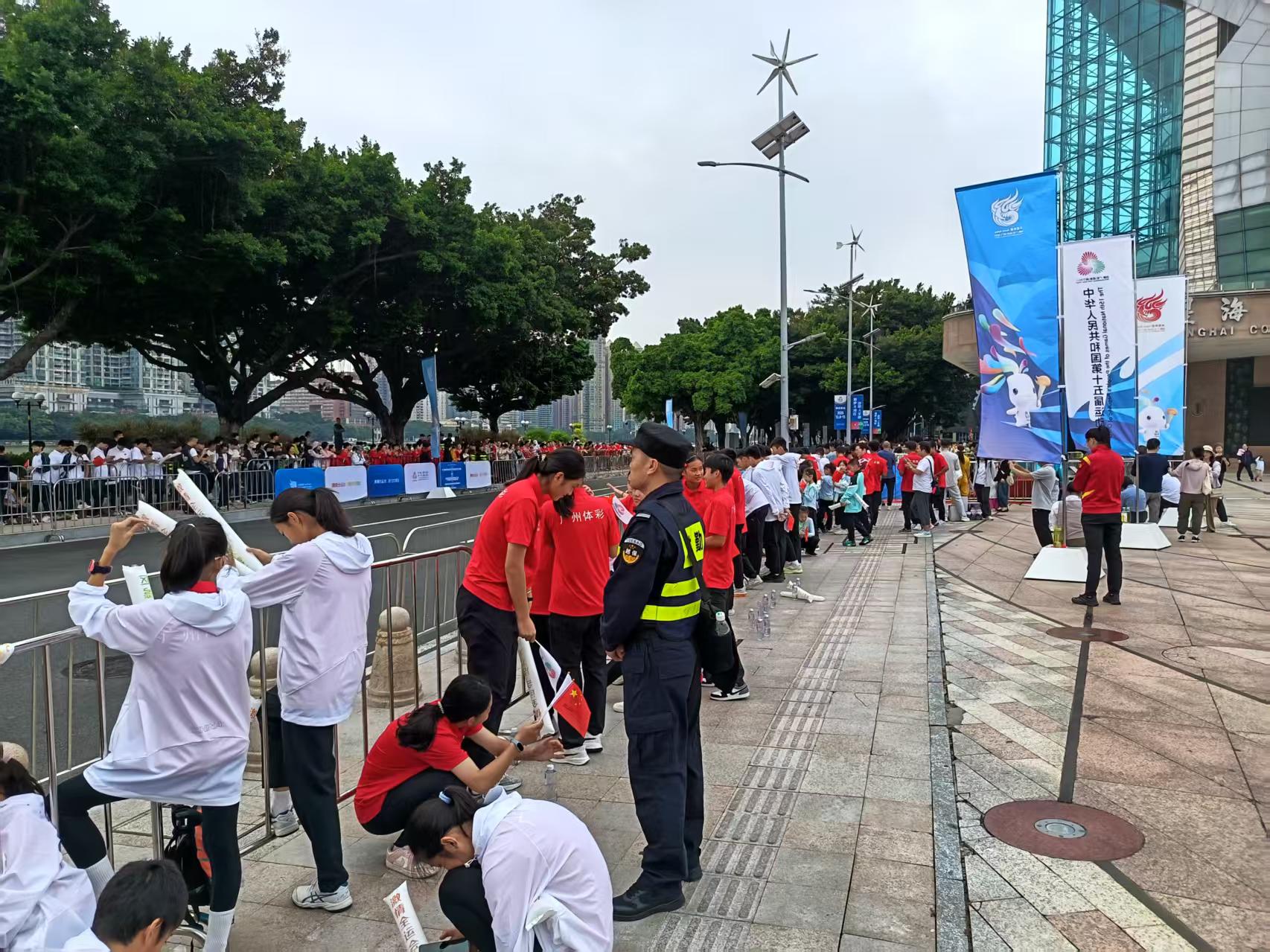 此次十五运会火炬传递广州站,起点设于历史悠久的镇海楼,终点落于现代璀璨的海心沙,11.6 公里的传递路线串联起城市的过去与未来。为确保火炬传递过程万无一失,市总保提前谋划、周密部署,组织1500 名专业安保力量,配备约15000个隔离设施,构建起一道坚实的安全防护网。