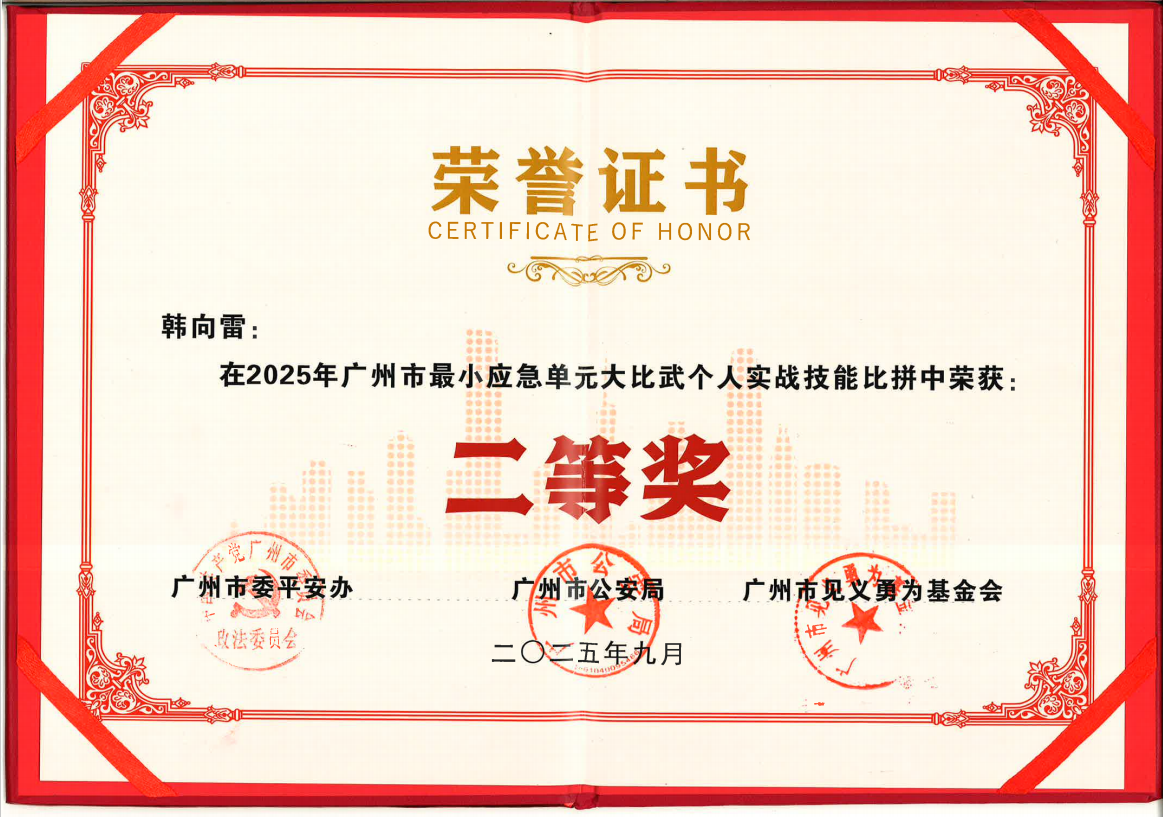 近期,“实战大练兵,齐心护全运”——广州市“广州街坊”群防共治队伍练兵比武总结暨最小应急单元实战演练大会在广州科学城国羽中心圆满举行。市委政法委主要领导出席活动并讲话,十五运会和残特奥会广州赛区执委会主要负责同志,市、区两级政法委和公安局及市直相关单位主要领导共同参会,见证了这场彰显“全民参与、共建共治”安全理念的重要盛会。其中,广州市天河保安服务有限公司奥体中心项目中队表现抢眼,在“2025广州市最小应急单元大比武”中勇夺团体一等奖(B类),队长韩向雷同志斩获个人二等奖,用硬核实力护卫全运会和残特奥会安全。