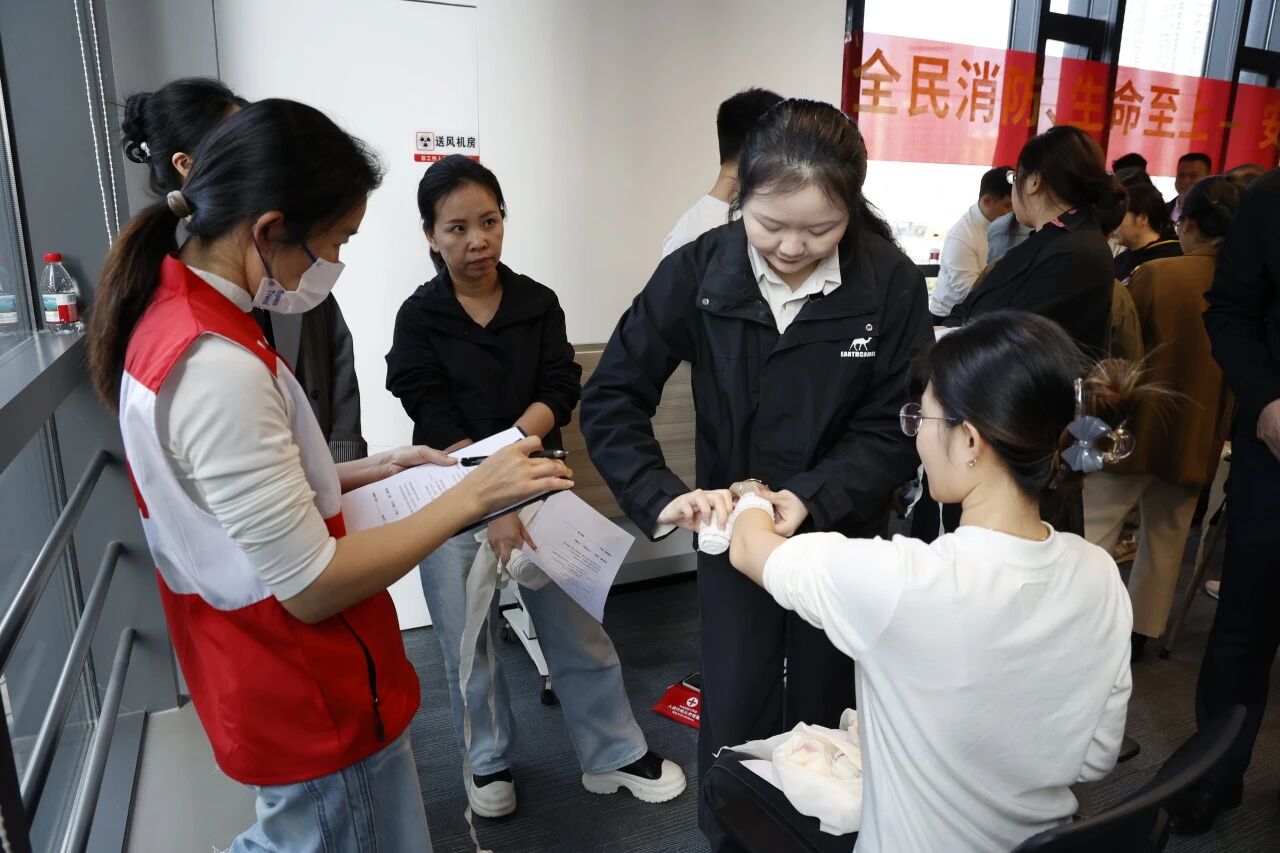 培训特邀专业机构讲师,系统讲授了心肺复苏(CPR)、AED使用、创伤包扎、常见急症处理等核心急救知识。课程注重实战,学员们在指导下反复练习胸外按压、人工呼吸及绷带包扎等关键技能,讲师团队逐一纠正,确保操作规范,现场学习氛围热烈。
