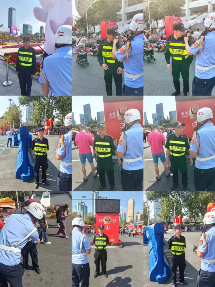 警保联动聚合力,协同共治筑平安。本次安保工作中,天河保安公司深度践行“公安主导、保安助力、联勤联动、共筑平安”的工作模式,与天河公安分局、现场交警密切配合,形成全方位、立体化的安保防控网络。执勤期间,全体安保队员统一着装、仪容整洁、精神饱满,严格恪守执勤规范,既当好“安全守护者”,也做好“便民服务员”。他们熟练掌握花市内外洗手间、地铁站出入口、医疗点、安保指挥部等关键位置分布,面对市民群众的咨询主动回应、细致指引,用真诚态度赢得了广泛认可;在现场管控中,队员们全面开展花市区域安全检查,细致检查、规范连接水铁马,严格落实全封闭管理,严防无关人员、车辆违规进入,从源头防范安全隐患。