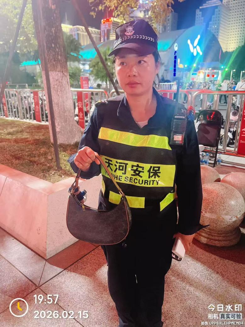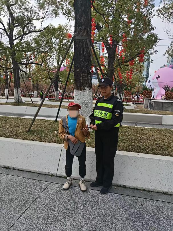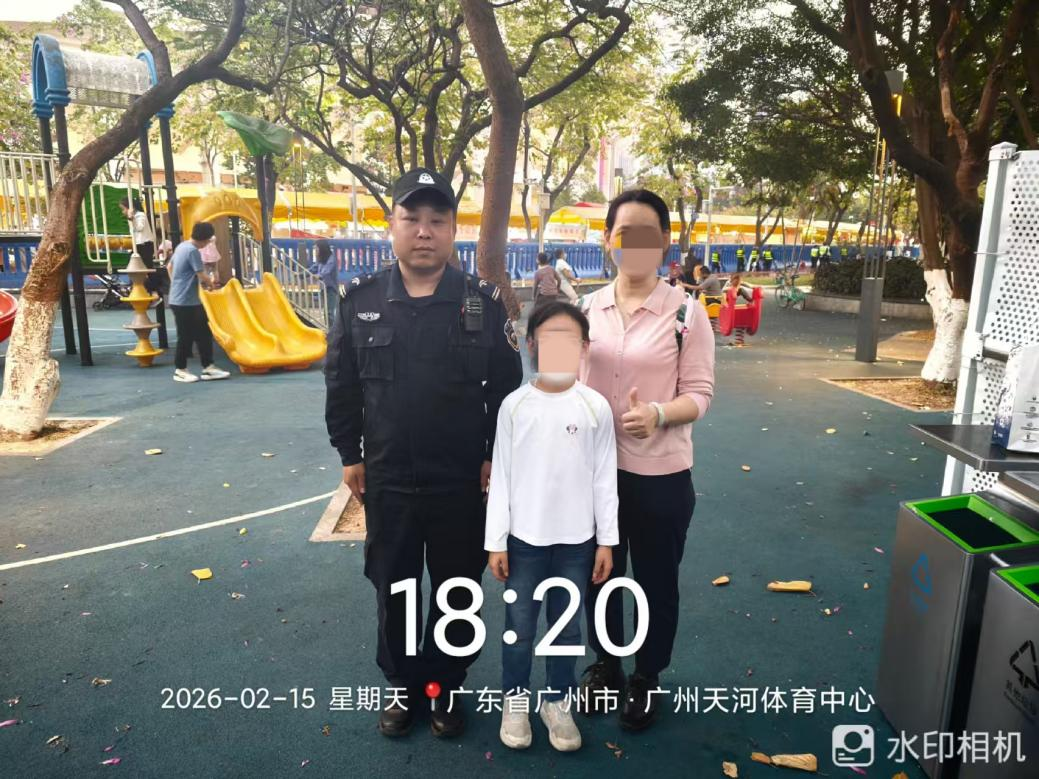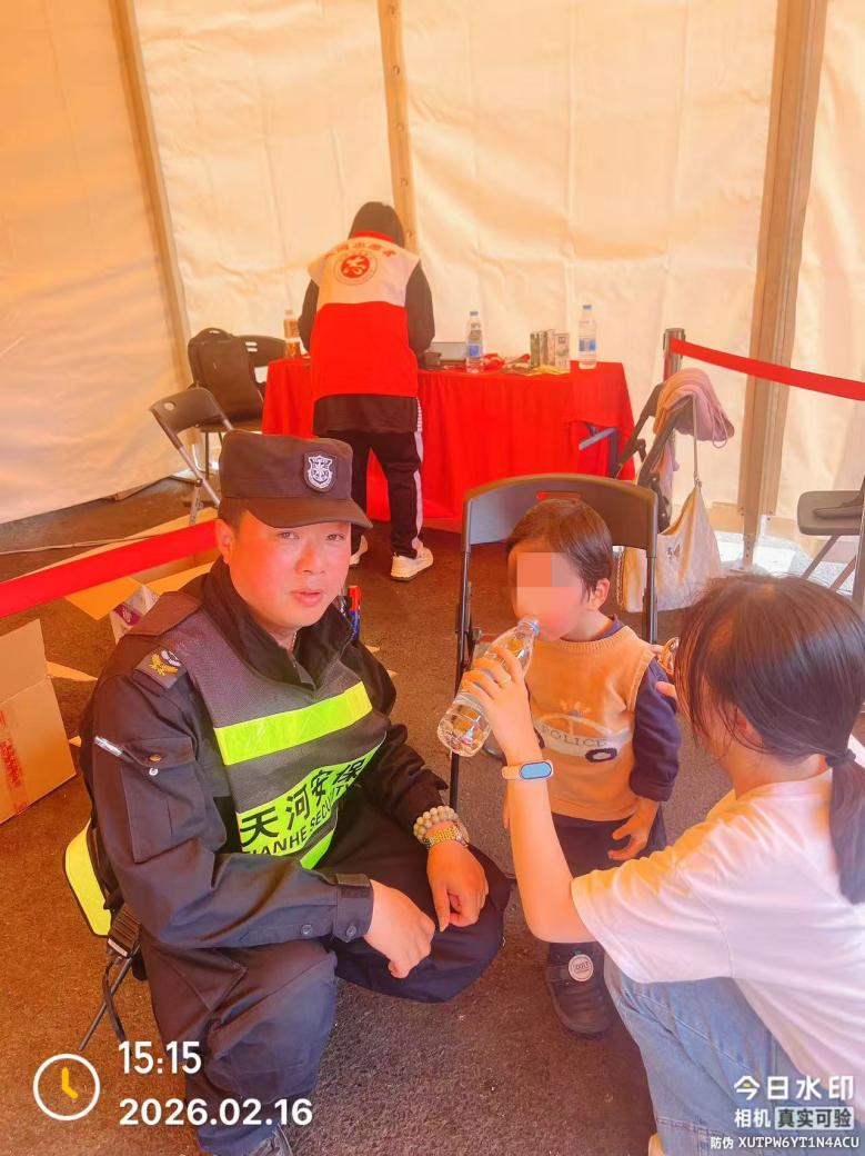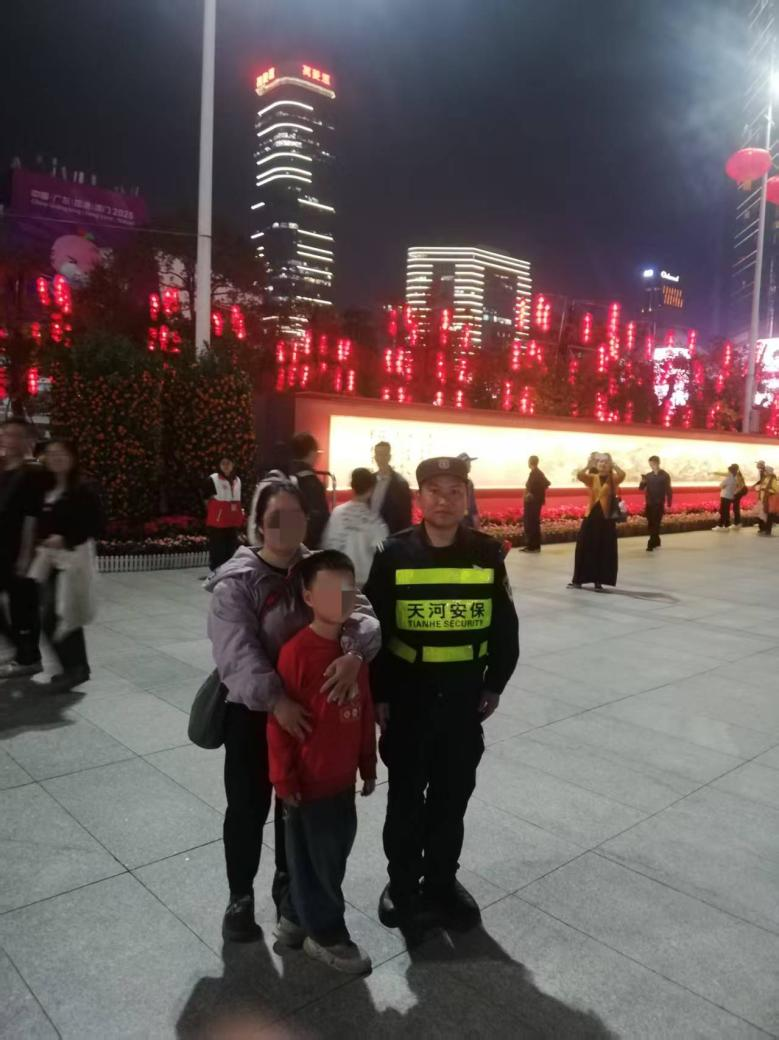 专业守护有力度,暖心服务有温度。在筑牢安全防线的同时,天河保安队员用一个个暖心善举,为这场新春盛会注入脉脉温情,彰显着广州这座超大城市的包容与善意。2月13日19时25分,核心区安保队员周小毛同志在巡逻时,发现一名孩童独自哭泣,他立即上前温柔询问,得知孩子与父母走失后,第一时间上报区域负责主管张海军同志,恰逢脱产队长王广记同志遇到寻找孩子的家长,双方通过对讲机核实信息,迅速完成对接,让孩童平安回到父母身边,家属对队员们的细心负责赞赏有加。