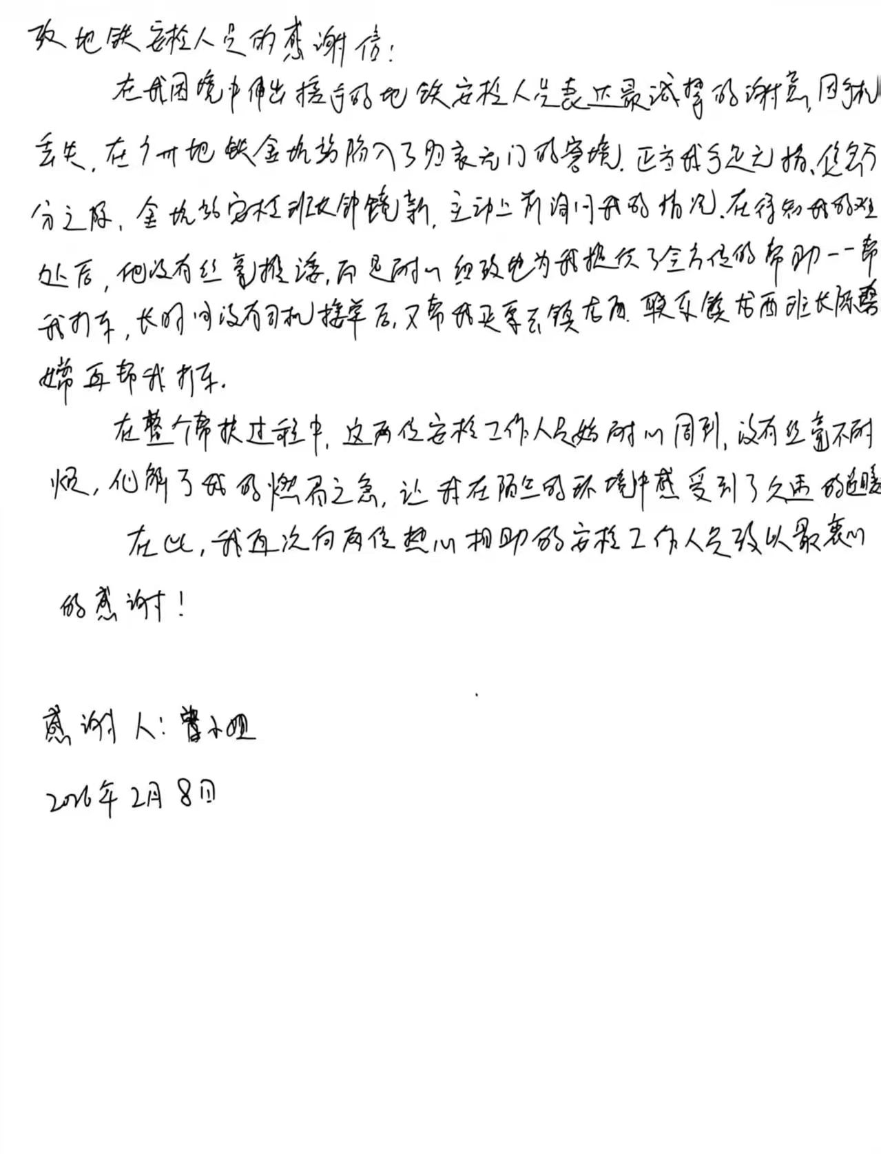 2月8日正值2026年春运高峰,广州地铁二十一号线金坑站人流如织,一名女乘客进站时发现手机丢失,一时无法联系家人。该站当值的市总保安检员钟镜新见状,立即上前询问并主动提供帮助。由于乘客记不清家属的联系方式,无法及时联系家人,钟镜新尝试帮忙打车,但长时间无人接单。见乘客焦急万分,钟镜新跟乘客商量之后,自费帮乘客购买前往镇龙西站的车票,并提前联系该站市总保安检员陈碧嫦说明情况。陈碧嫦在镇龙西站接到乘客后,细心安抚乘客并帮其打车送她回家。女乘客临别感激,写下一封感谢信。市总保安检员在两个地铁站双向联动、默契配合,用贴心守护与接力相助,解决乘客燃眉之急,生动体现了市总保安检队伍团队协作精神与服务意识。
