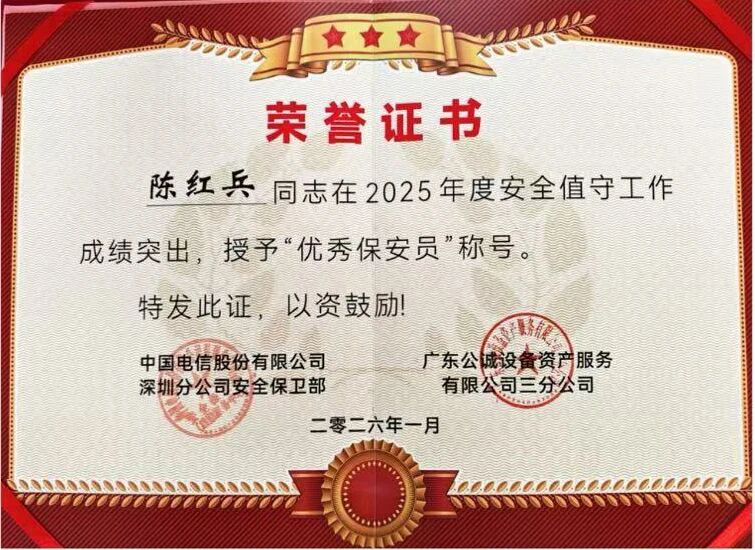此次表彰中,罗湖保安公司派驻深圳电信保安队共17名队员,因年度安全值守工作成绩突出,荣获