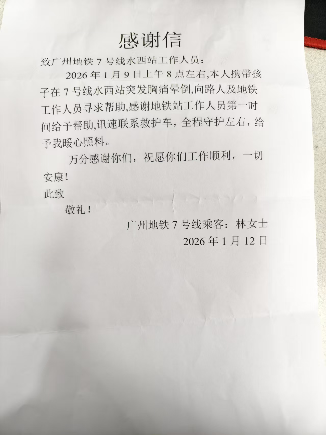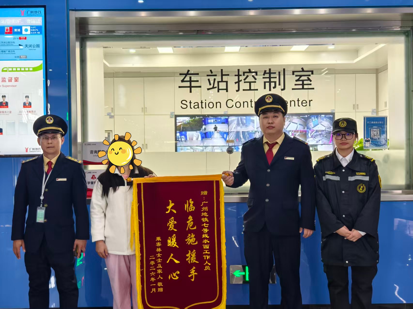 2026年1月9日,广州地铁二十一号线水西站,一名女乘客因突发胸痛晕倒,情况危急。在站厅第一时间发现异常的市总保地铁安检员,没有片刻犹豫,立即启动应急处置流程,为后续救援争取了宝贵的时间窗口。他们迅速响应,冷静、有序地对乘客实施初步救助,有效避免了现场混乱,为专业医疗救援创造了有利条件。随后,安检人员将乘客平安护送并移交给医护人员。整个过程中,安检员们熟练掌握应急预案、紧密协同岗位协作,充分展现了对乘客生命高度负责的职业态度。