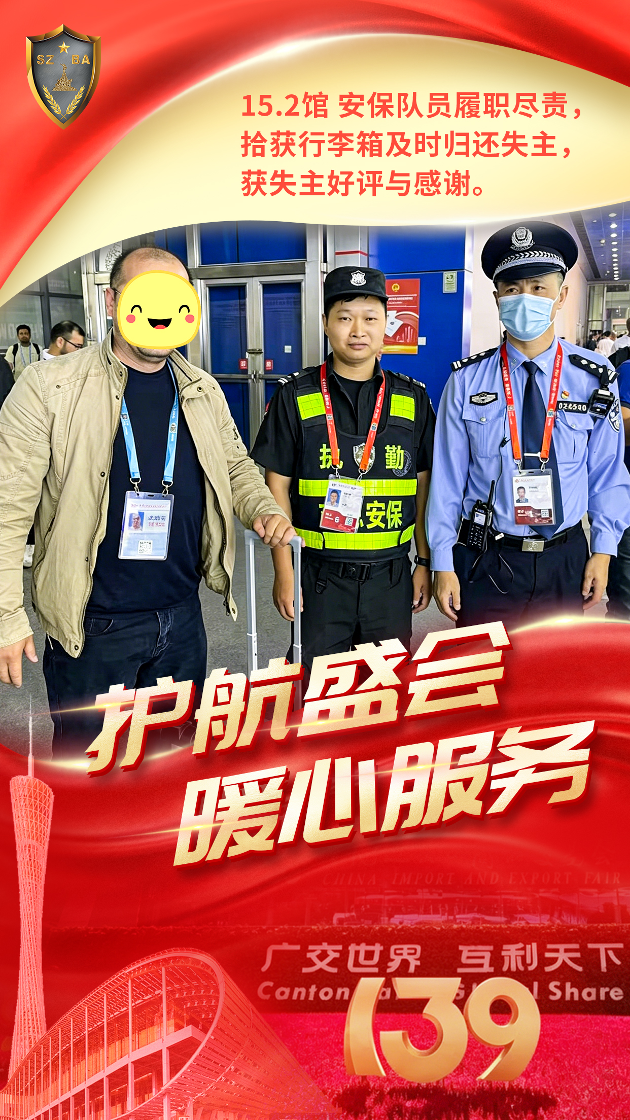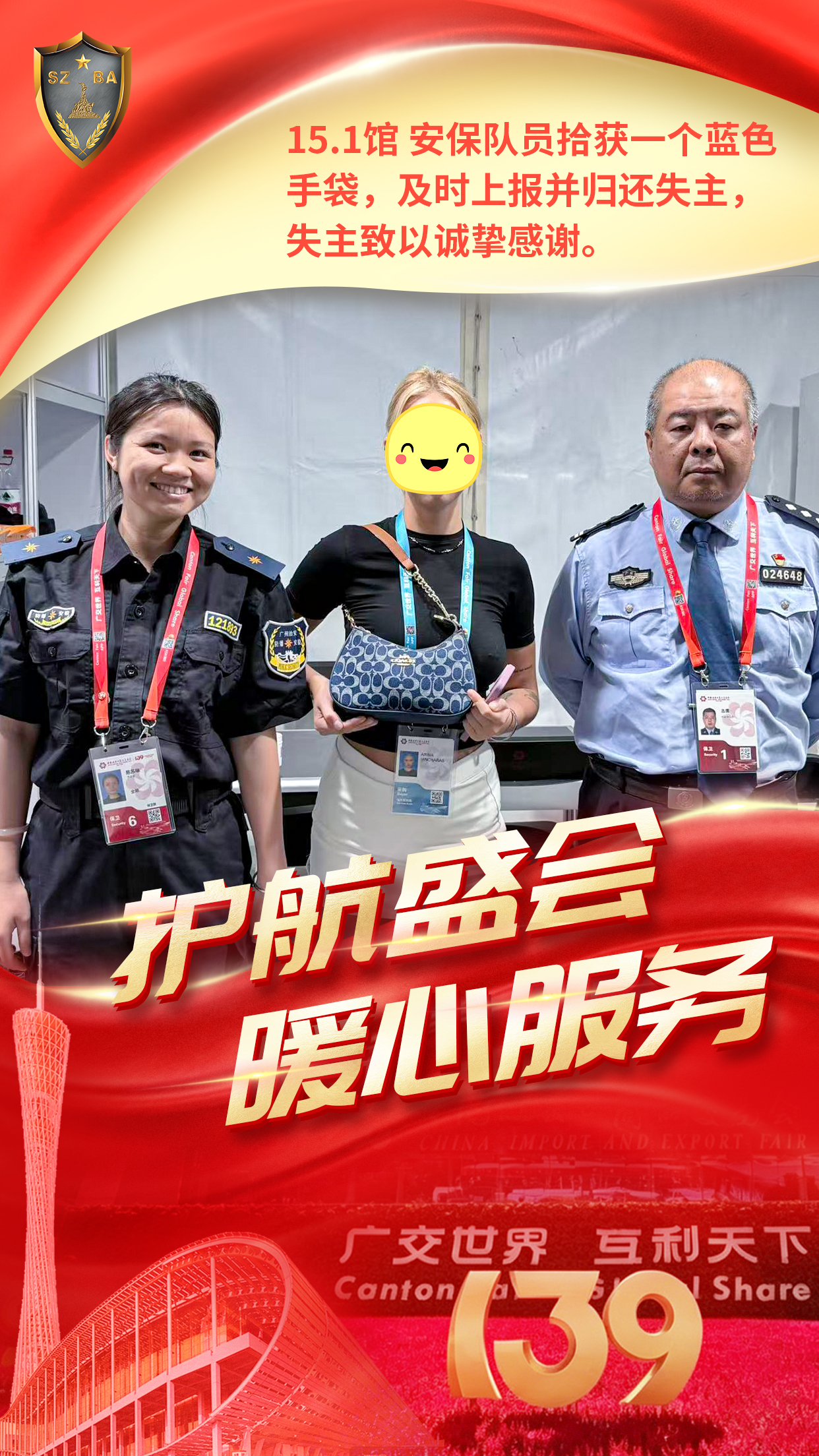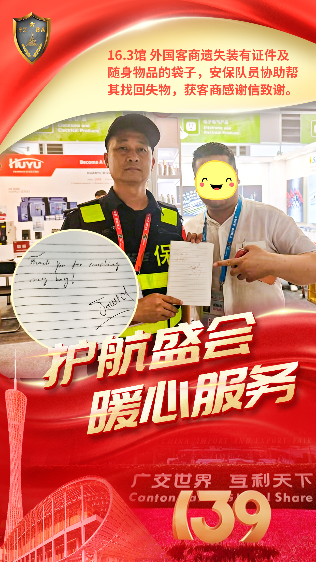 第139届广交会万商汇聚、人潮涌动。这里不仅是国内外贸易的盛会,也是无数温暖瞬间交汇的窗口。广州市总保安服务有限公司(简称“市总保”)的安保队员们,用行动守护安全,也用善意温暖人心。当客商突感不适时,有人一路小跑、护送就医;当展位灯座短路冒烟时,有人闻讯而至、果断处置;当证件、手机、行李箱不慎遗失时,有人比失主还着急,协助调监控、找线索、多方联络,只为让那份焦急的等待迎来“物归原主”的笑脸。这些暖心瞬间每天都在发生,在市总保安保队员被汗水浸湿的衣背里,在那一次次俯身询问的耐心里,在每一次拾金不昧后的默默转身里……