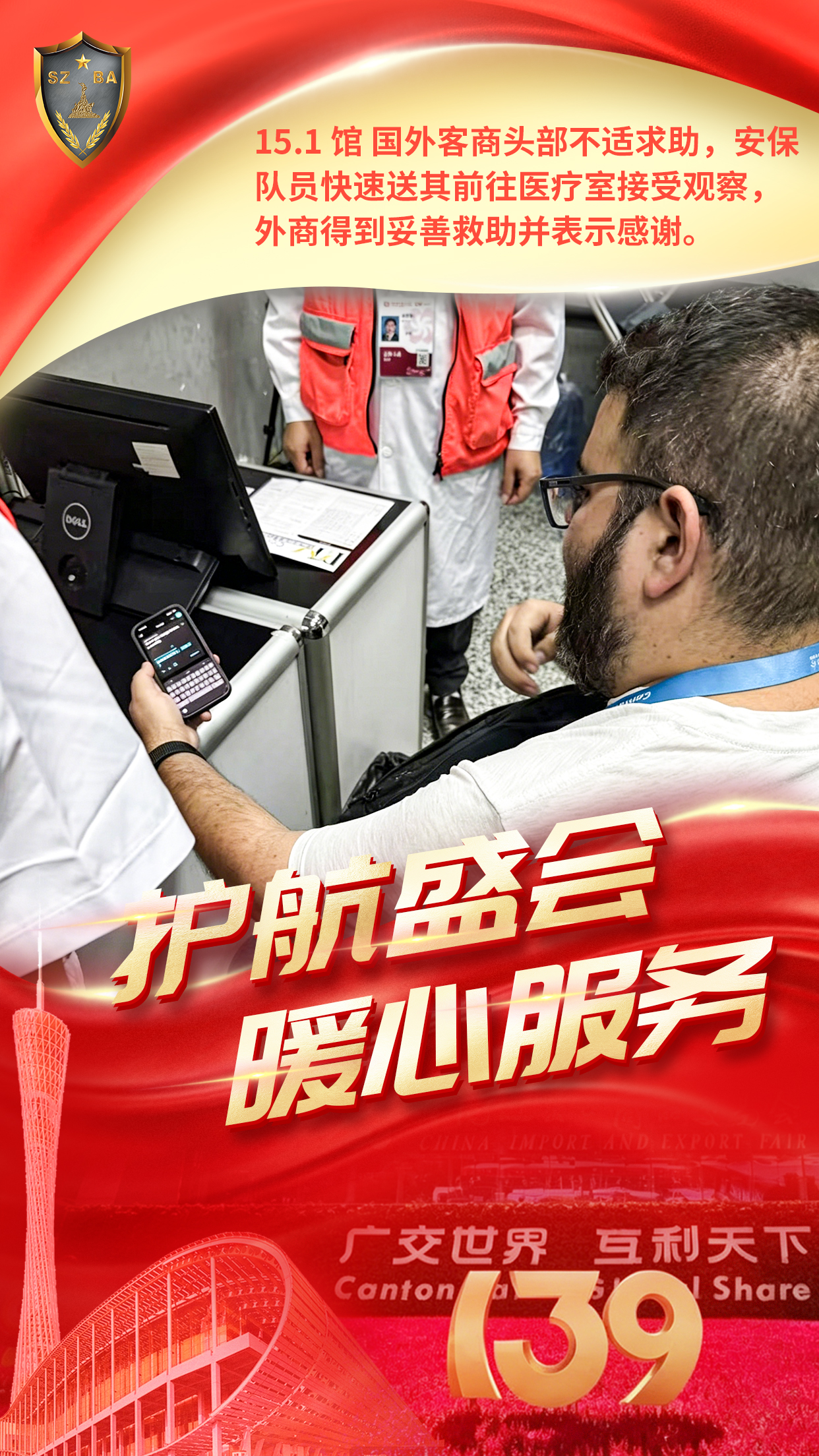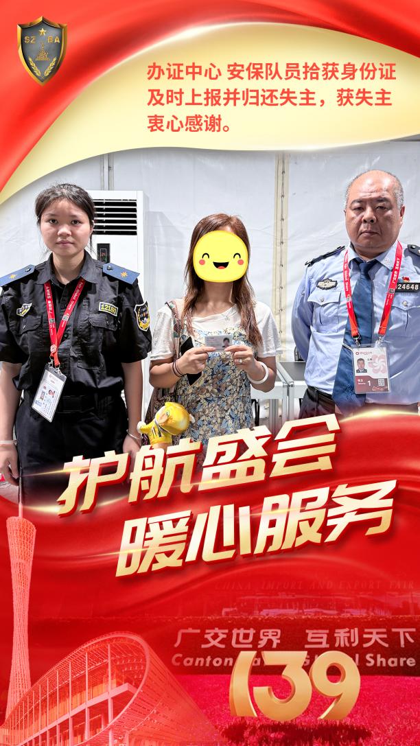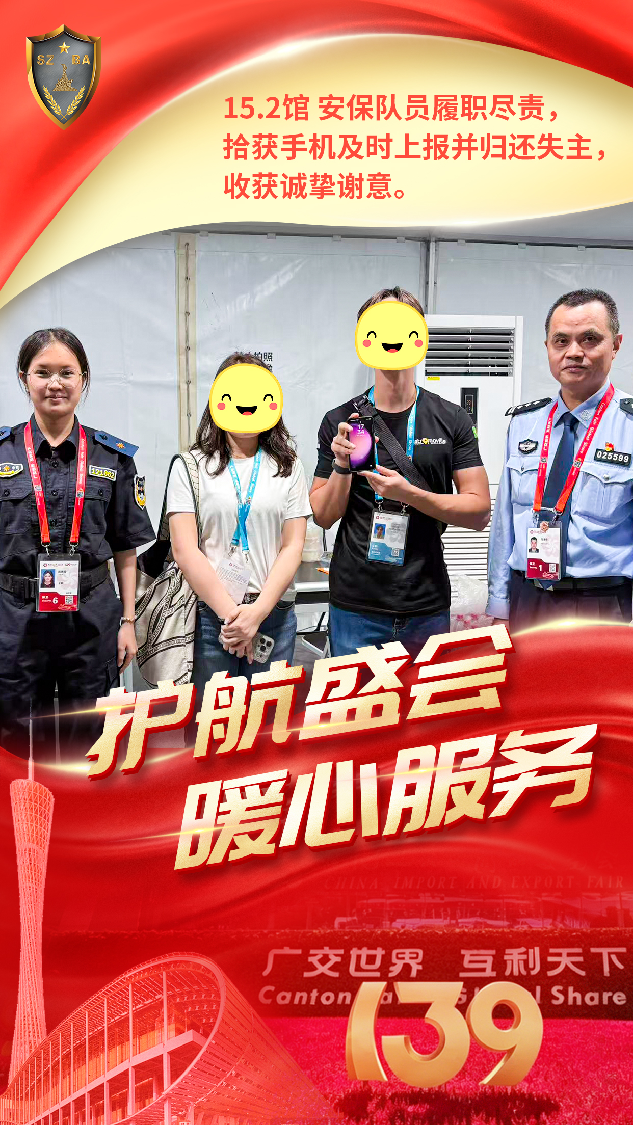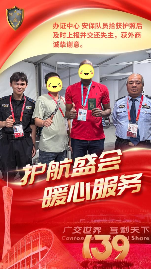 第139届广交会万商汇聚、人潮涌动。这里不仅是国内外贸易的盛会,也是无数温暖瞬间交汇的窗口。广州市总保安服务有限公司(简称“市总保”)的安保队员们,用行动守护安全,也用善意温暖人心。当客商突感不适时,有人一路小跑、护送就医;当展位灯座短路冒烟时,有人闻讯而至、果断处置;当证件、手机、行李箱不慎遗失时,有人比失主还着急,协助调监控、找线索、多方联络,只为让那份焦急的等待迎来“物归原主”的笑脸。这些暖心瞬间每天都在发生,在市总保安保队员被汗水浸湿的衣背里,在那一次次俯身询问的耐心里,在每一次拾金不昧后的默默转身里……