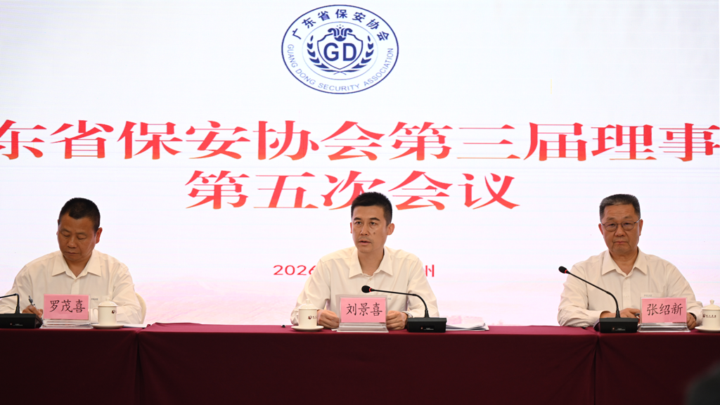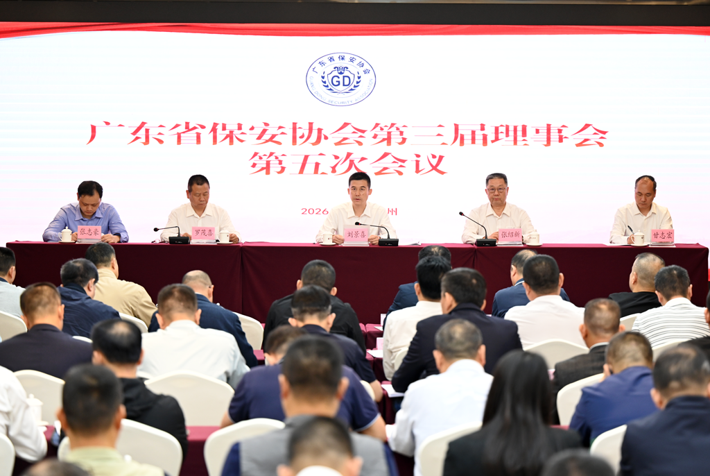2026年3 月 26 日上午,广东省保安协会第三届理事会第五次会议在广州召开。会议由省保安协会会长张绍新主持,省公安厅治安管理总队总队长刘景喜出席会议并讲话,省保安协会秘书长罗茂喜、监事长甘志宏及各理事、监事等共计一百余人参加会议。