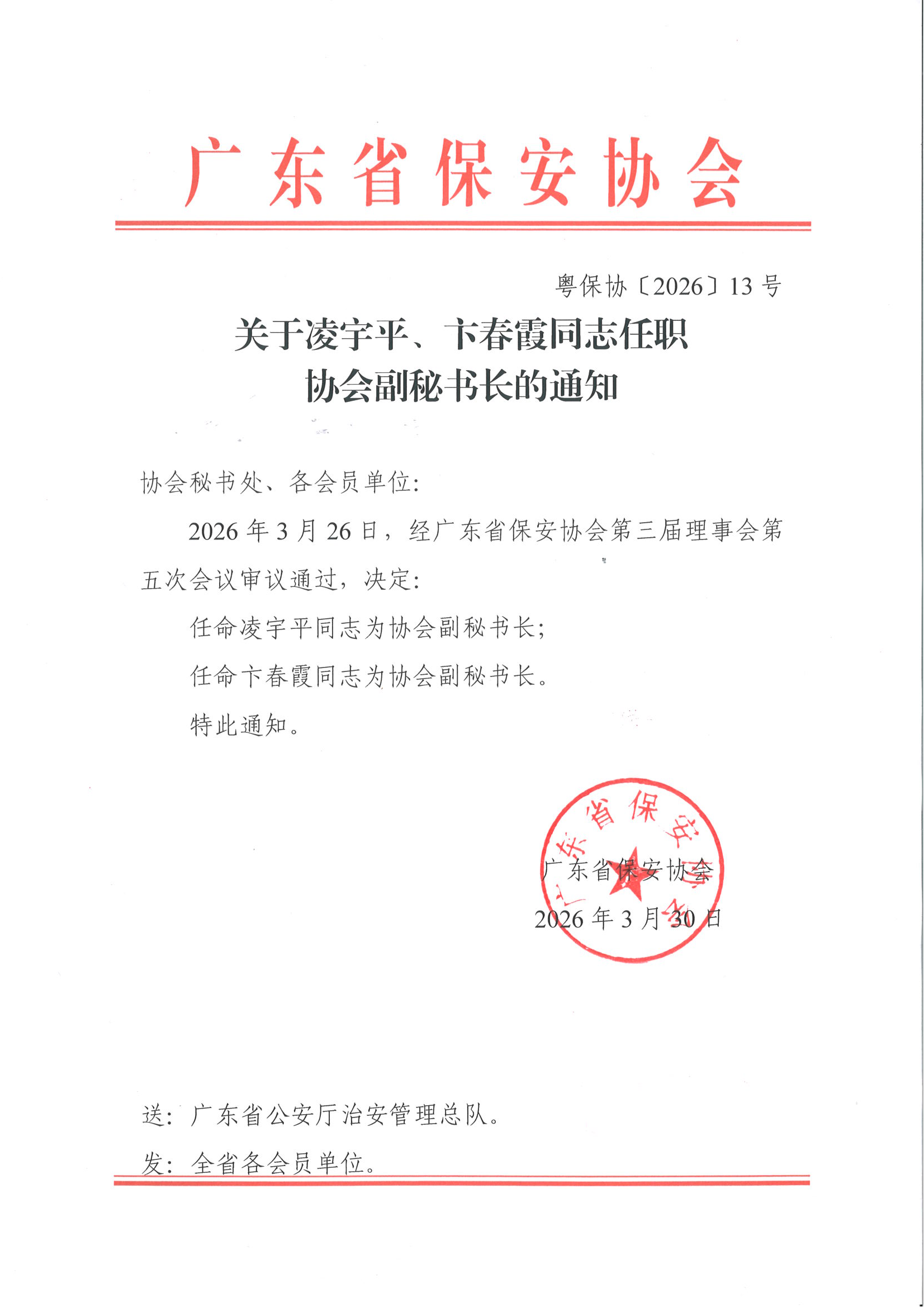 2026年3月26日,经广东省保安协会第三届理事会第五次会议审议通过,决定: